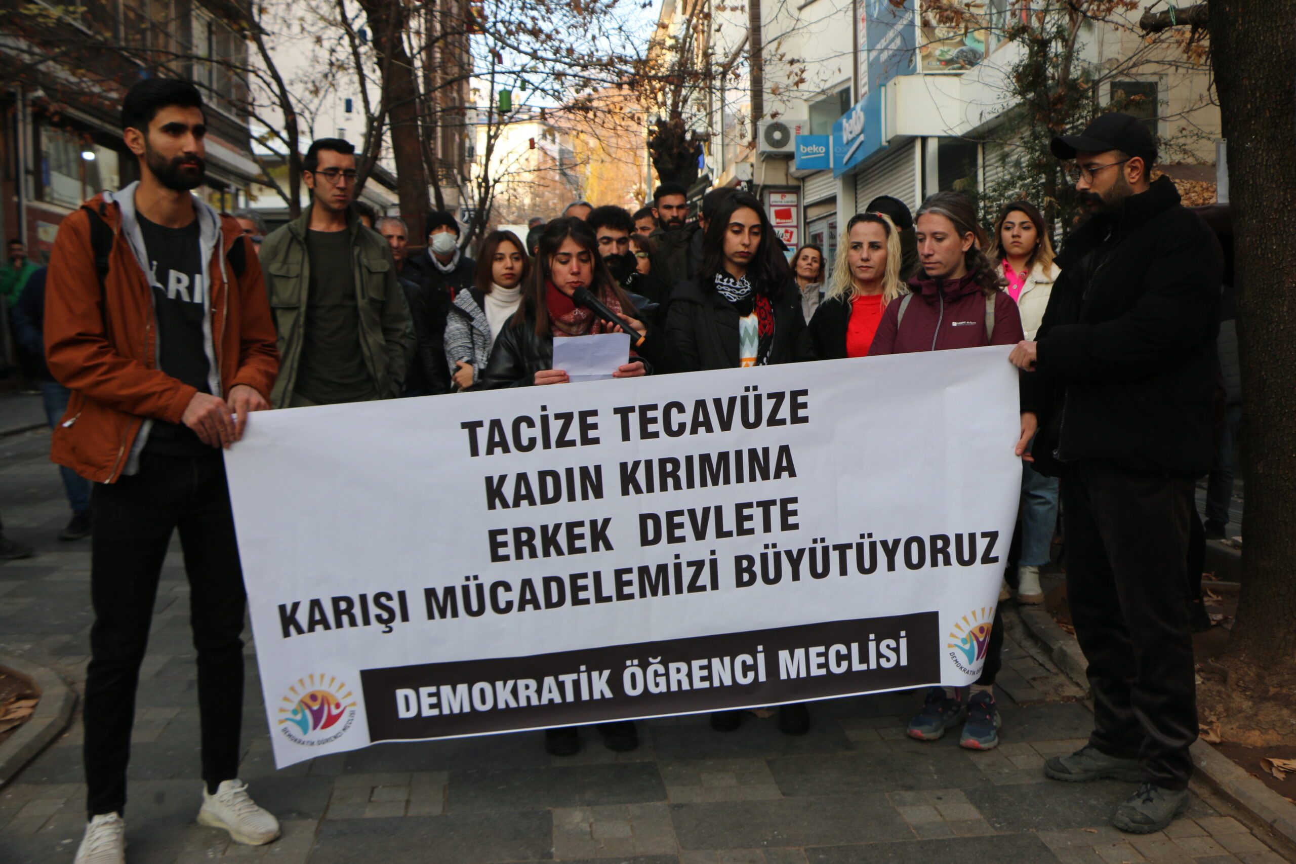 Demokratik Öğrenci Meclisi, Dersim’de bir kadın öğrencinin diş hekimi Mehmet Demirbaş tarafından sözlü ve fiziksel olarak tacize uğramasına tepki göstermek için Sanat Sokağı’nda basın açıklaması yaptı. Açıklamada, ‘Tacize, tecavüze, kadın kırımına ve erkek devlete karşı mücadelemizi büyütüyoruz’ pankartı açıldı.