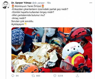 Acil Tıp Uzmanı Dr. Sarper Yılmaz, “Alüminyum yanık örtüsü. Enkazdan çıkarılanların üzerindeki parlak şey nedir?, Günlük hayatta kullanılan birşey midir?, Afet çantalarında bulunur mu, Amaç nedir?, Soruları çok soruldu.Açıklayayım” sözleriyle yurttaşların merak ettiği soruları sosyal medya hesabından yanıtladı.