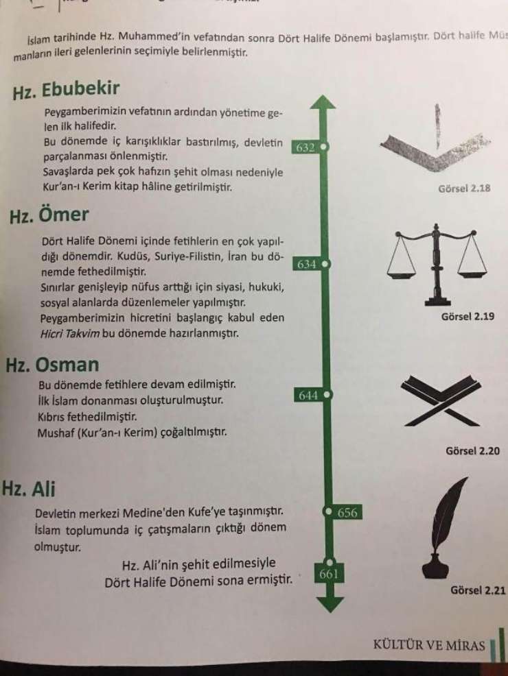 Cumhuriyet’ten Leyla Kılıç’ın haberine göre ortaokul ve imam hatip ortaokulunda okutulan altıncı sınıf sosyal bilgiler ders kitabının bir sayfasında ‘dört halife’den bahsedildi.