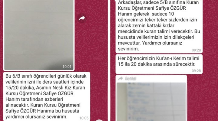 Ankara Şehit Sıddık Uluocak İmam Hatip Ortaokulu müdürünün, okulda görev yapan bir öğretmene konuya ilişkin “İsmi yazılı öğrencilerin, veli izni ile ders saatlerinde Asımın Nesli Kur’an Kursu öğretmeni Safiye Hanım tarafından ezberleri alınacaktır. Safiye Hanım’a bu hususta yardımcı olursanız sevinirim. Bu hususta velilerimizin dilekçeleri mevcuttur. Safiye Hanım, 10 öğrencimize teker teker sizlerden izin alarak zemin kattaki kızlar mescidinde Kur’an talimi verecektir” şeklinde mesaj attığı belirtildi.