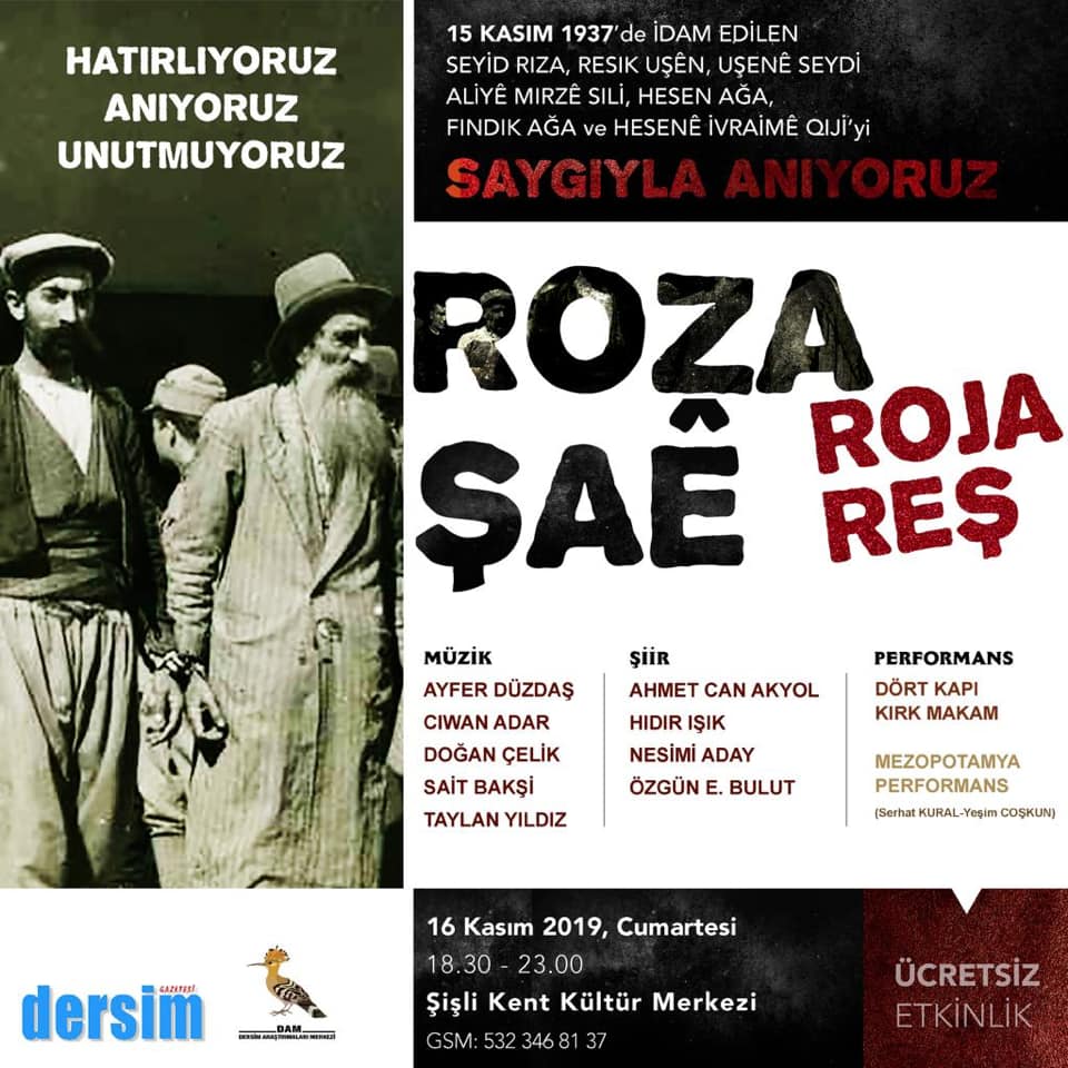 Yapılan çağrıda, “Seyyit Rıza ve yol arkadaşları Uşenê Seydi, Aliye Mirzê Sili, Hesenê İvrahime Qıji, Hesen Ağa, Fındık Ağa, Resik Uşen’i idamlarının 82. yılında anıyoruz. Unutmamak ve unutturmamak adına 16 Kasım 2019 Cumartesi Saat 18.30’da Şişli Kent Kültür Merkezinde buluşuyoruz” ifadeleri yer aldı.