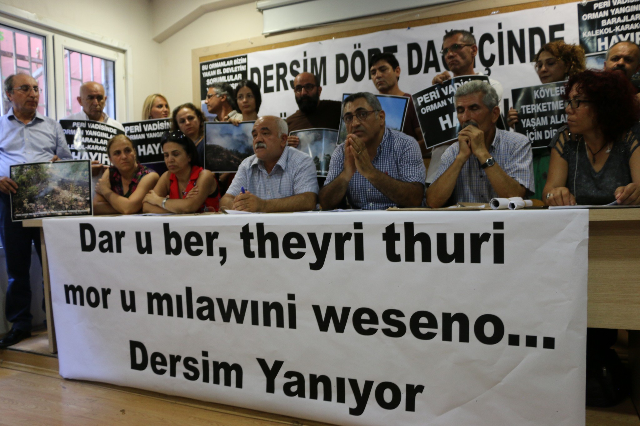 Dersim’deki yangınlara ilişkin İnsan Hakları Derneği İstanbul Şubesi’nde yapılan basın açıklamasına Dersim Dernekler Federasyonu, Munzur Koruma Koruma Kurulu, KARDEF, Peri Suyu Koruma Platformu, Doğu ve Güneydoğu Dernekleri Platformu, Munzur Çevre Derneği, Pir Sultan Abdal Kültür Derneği, Demokratik Alevi Dernekleri, HDK Ekoloji Meclisi, Yeşil Öfke Ekoloji Meclisi, Senoz Vadisi Koruma Platformu üyelerinin yanı sıra CHP, HDP yöneticileri ve Alevi sanatçılar da katıldı.
