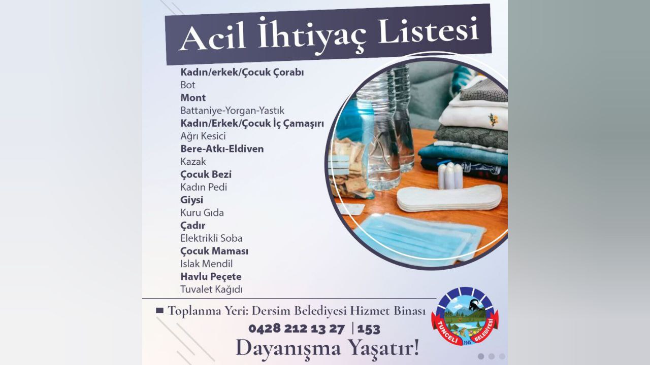 “Merkez üssü Kahramanmaraş’ın Pazarcık ilçesi olan, 7.4 büyüklüğünde depremde hayatlarını kaybeden yurttaşlarımıza baş sağlığı, yaralılara acil şifalar diliyoruz. Göçük altında kalanların da bir an evvel çıkarılmasını umuyoruz. Dersim Emek ve demokrasi platformu bileşenleri olarak dayanışmayı güçlendirmek için çaba göstereceğiz. Bunun için çalışmalara başlanmıştır. Deprem bölgelerine ulaştırılmak üzere bir kampanya başlatıyoruz. Çadır, konserve, kuru gıda, uyku tulumu, battaniye, mont, bot, kışlık kullanılmamış giysi, kullanılmamış içlik, kullanılmamış çorap, bere atkı, eldiven. kadın pedi, çocuk bezi, çocuk maması, elektrikli soba, el feneri, powerbank öncelikli ihtiyaçların deprem bölgelerine gönderilmesine dair Emek ve Demokrasi platformu bileşenlerimize ulaşabilirler. Yapılacak yardımlar, Dersim Belediyesi Kadın Yaşam merkezinde toplanarak ihtiyaç sahiplerine gönderilecektir. Halkımızı dayanışmaya çağırıyoruz.”