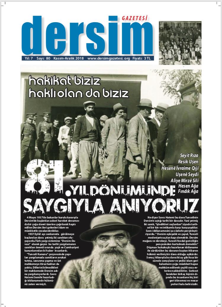 Dersim Gazetesi’nin Kasım/Aralık 2018 tarihli 80. Sayısı Seyit Rıza, Resik Uşen, Hesenê İvraime Qıji, Uşenê Seydi, Aliye Mirzê Sili, Hesen Ağa, Fındık Ağa’nın bundan 81 yıl önce Elazığ Buğday Meydanında idam edilişlerinin yıl dönümüne denk getirilecek şekilde “HAKİKAT BİZİZ HAKLI OLAN DA BİZİZ” manşetiyle çıktı.