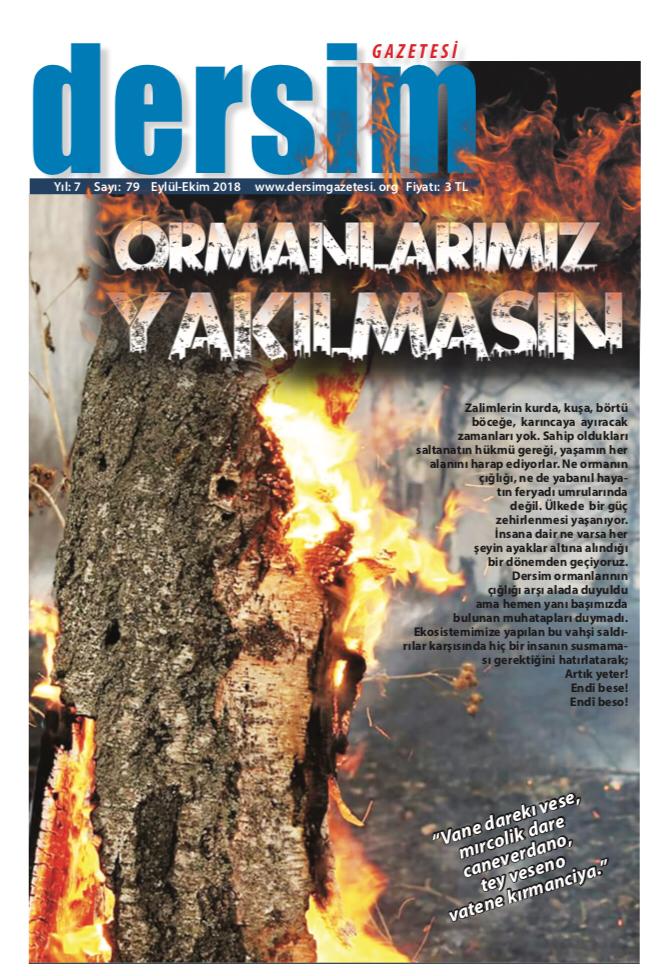 PİRHA- Dersim Gazetesi’nin Eylül/Ekim 2018 tarihli 79. sayısı ‘Ormanlarımız yakılmasın’ manşetiyle çıktı.