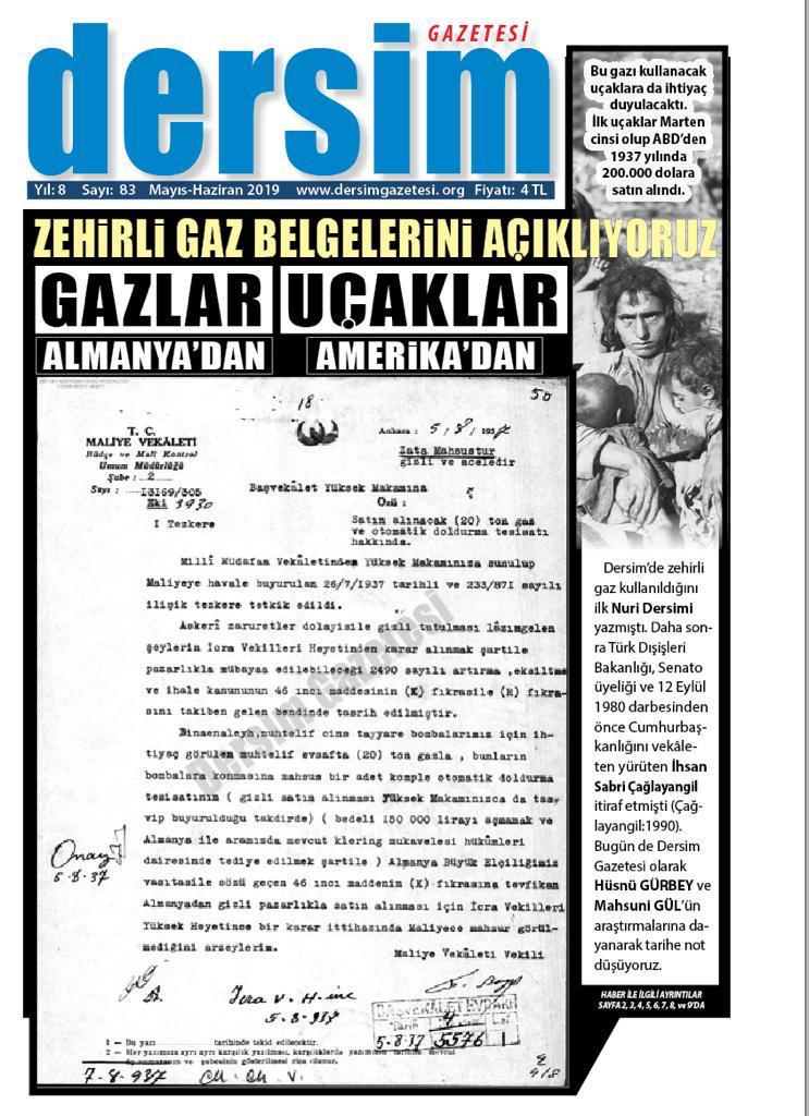 Dersim’de zehirli gaz kullanıldığını ilk Nuri Dersimi yazmıştı. Daha sonra Türk Dışişleri Bakanlığı, Senato üyeliği ve 12 Eylül 1980 darbesinden önce Cumhurbaşkanlığını vekâleten yürüten İhsan Sabri Çağlayangil de verdiği bir röportajda itiraf etmişti. Bugün de Dersim Gazetesi Hüsnü Gürbey ve Mahsuni Gül’ün araştırmalarına dayanarak, Dersim Katliamı öncesi (1937) Türkiye’nin Almaya’dan zehirli gaz ve ABD’den de bombardıman uçakları alındığının belgelerini yayınlayarak tarihe not düştü.