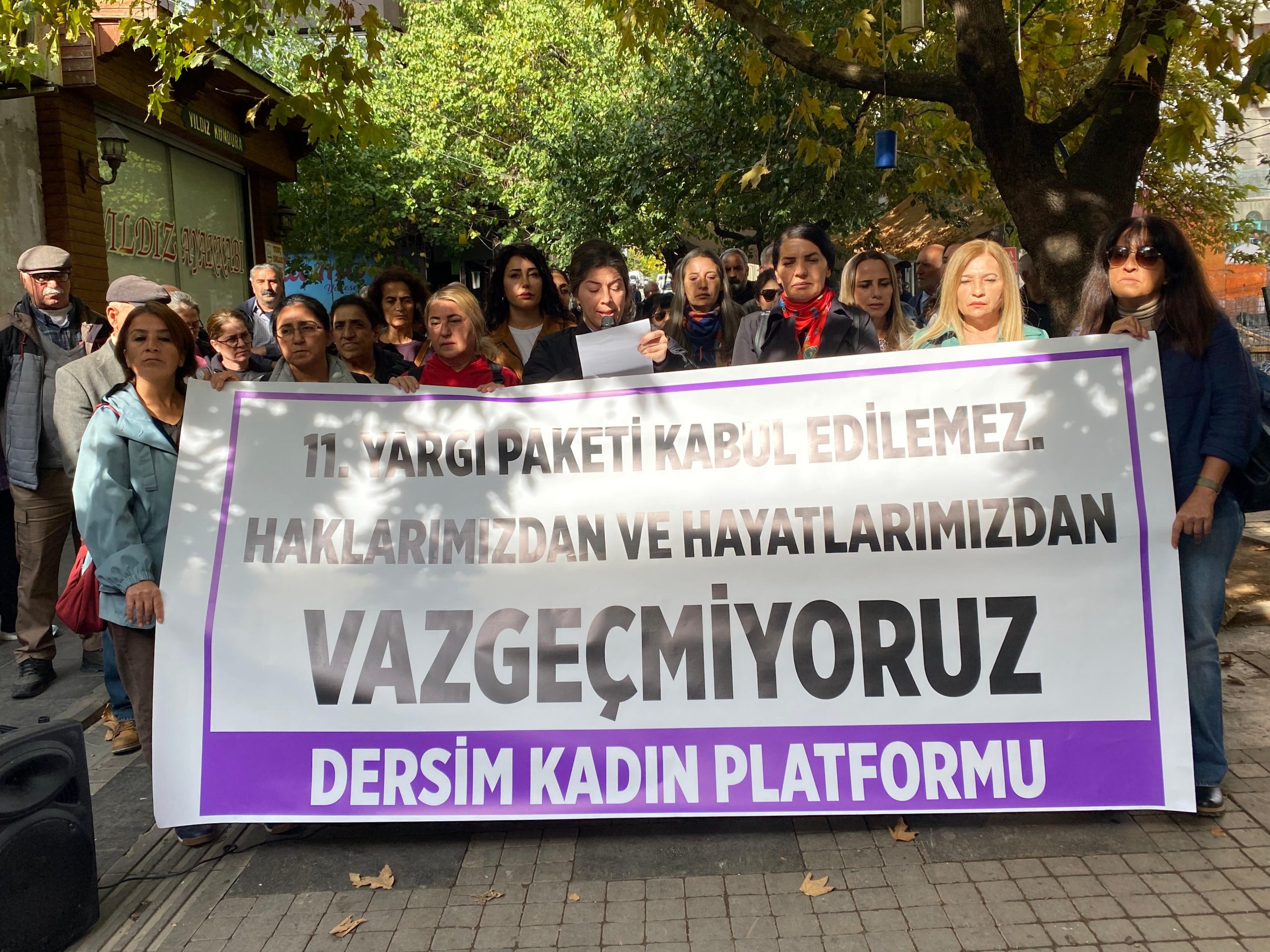 Dersim Kadın Platformu11. Yargı Paketi’ne karşı Sanat Sokağı’nda basın açıklaması yaptı. ’11. Yargı Paketi kabul edilemez, haklarımızdan ve hayatlarımızdan vazgeçmiyoruz’ pankartının açıldığı açıklamayı platform adına Elif Yıldız okudu.