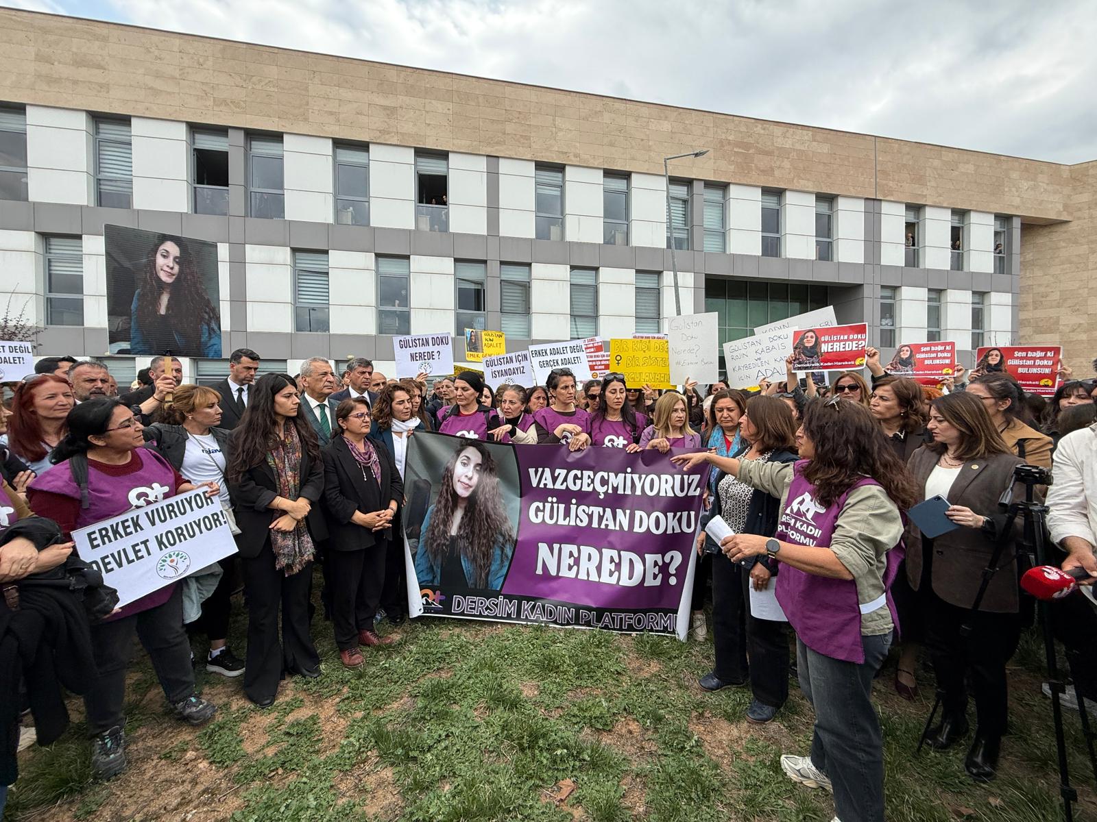 Adliye Binası önünde yapılan açıklamaya DEM Parti ve CHP’li milletvekilleri destek verdi. Açıklamada konuşan İHD Dersim Şube Eş Başkanı Nurşat Yeşil, 6 yıl boyunca “Erkek adalet değil gerçek adelet”, “Gülistan Doku nerede?” diye haykırdıklarını belirterek, kadınların mücadelesiyle gelişmelerin yaşandığını ifade etti. Yeşil, Kaybedilen ve katledilen kadınlar için mücadele edeceklerini söyledi.