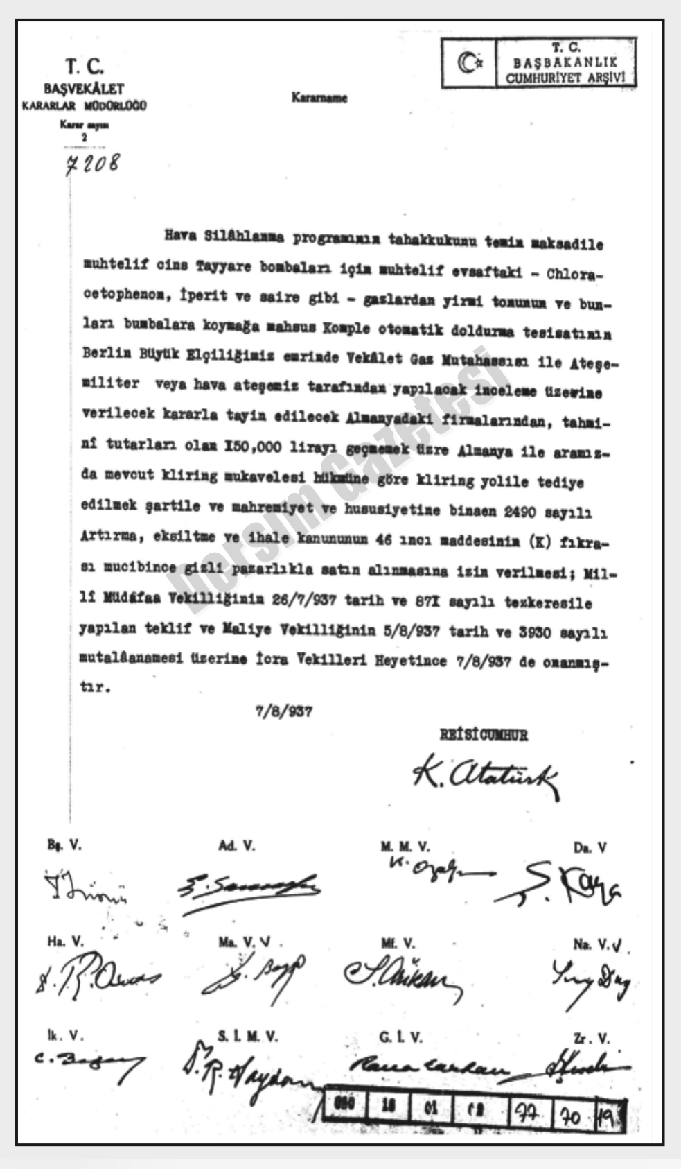 Hava Silahlanma Programının tahakkukunu temin maksadile muhtelif cins Tayyare bombaları için muhtelif evsaftaki -Chloracetophenon, İperit ve saire gibi- gazlardan yirmi tonunun ve bunları bombalara koymağa mahsus Komple otomatik doldurma tesisatının Berlin Büyük Elçiliğimiz emrinde Vekalet Gaz Mütahassısı ile Ateşemiliter veya hava ateşemiz tarafından yapılacak inceleme üzerine verilecek kararla tayin edilecek. Almanya’daki firmalarından, tahmini tutarları olan 150.000 lirayı geçmemek üzere Almanya ile aramızda mevcut Kliring Mukavelesi hükmüne göre Kliring Volile tediye edilmek şartı ile ve mahremiyet ve hususiyetine binaen 2490 sayılı Artırma, Eksiltme ve İhale Kanunu’nun 46’ıncı maddesinin (K) fıkrası mucibince gizli pazarlıkla satın alınmasına izin verilmesi; Milli Müdafaa Vekilliğinin 26/ 7/ 1937 tarih ve 871 sayılı tezkeresi ile yapılan teklif ve Maliye Vekilliğinin 5/ 8/ 1937 tarih ve 3930 sayılı mutalaanamesi üzerine İcra Vekilleri Heyetince 7/ 8/ 1937 de onanmıştır.