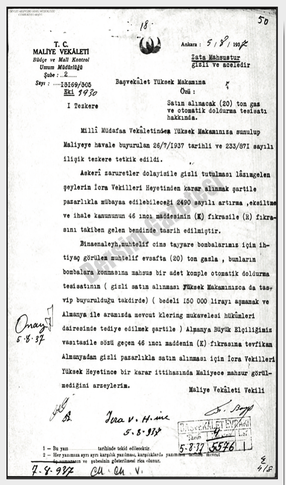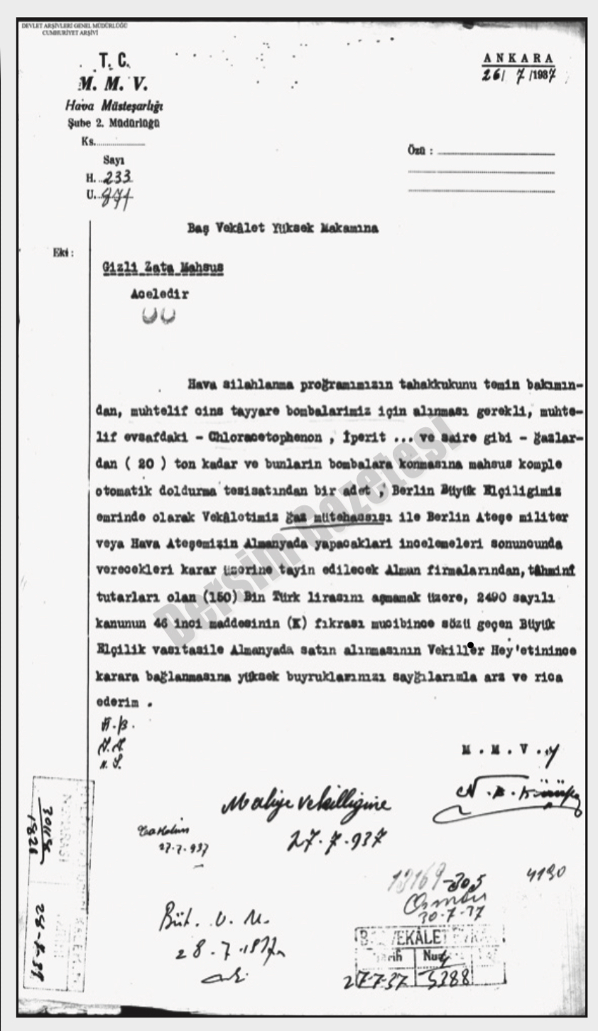 Reisicumhur Kemal Atatürk, Nazi Almanya’sından 20 ton Chloracetophenon ve İperit vs. gazları ve bu gazları bombalara koymaya yarayacak otomatik tesisatları almak için Maliye Bakanlığı’na 26/7/1937 tarihinde 871 sayılı tezkere ile başvurur. Maliye Bakanlığı, o zamanlar ticari ilişkilerin oldukça iyi olduğu Almanya’dan, 150 bin Türk lirasını geçmemek ve takas (klering) usulü ile ve eksiltme ve artırma yoluyla bu gazın alınmasına 5/8/937 tarihinde onay verir.