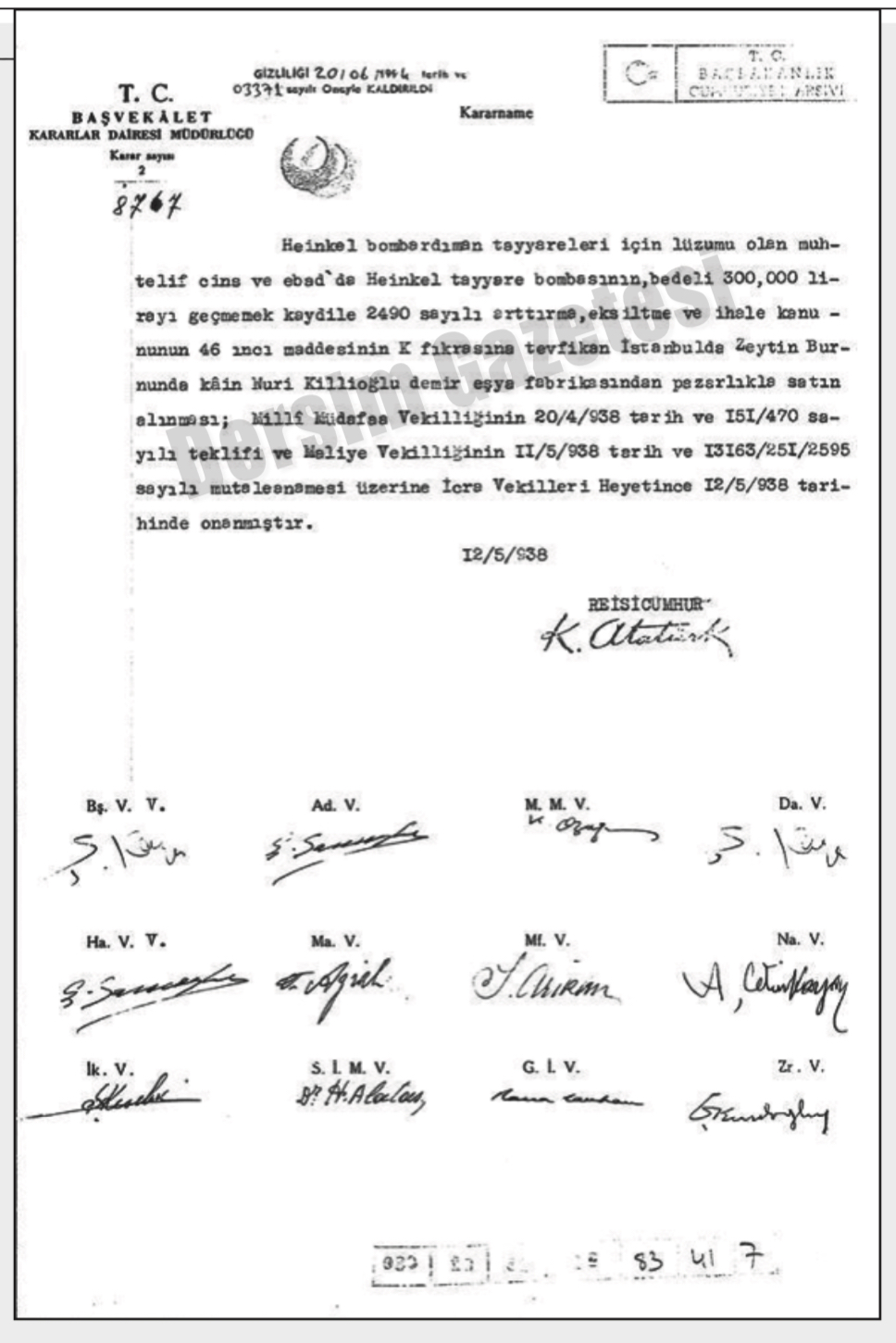 “Heinkel bombardıman tayyareleri için lüzum olan muhtelif cins ve ebatta Heinkel tayyare bombasının bedeli 300 bin lirayı geçmemek kaydıyla 2490 sayılı arttırma, eksiltme ve ihale kanununun 46’ıncı maddesinin K fıkrasına tevfikan İstanbul’da Zeytinburnu’nda kain Nuri Killioğlu demir eşya fabrikasından pazarlıkla satın alınması; Milli Müdafaa Vekilliğinin 20/4/938 tarih ve 151/470 sayılı teklifi ve Maliye Vekilliğinin 11/5/938 tarih ve 13163/251/2595 sayılı mütalanamesi üzerine İcra Vekilleri Heyetince 12/5/938 tarihinde onanmıştır.
