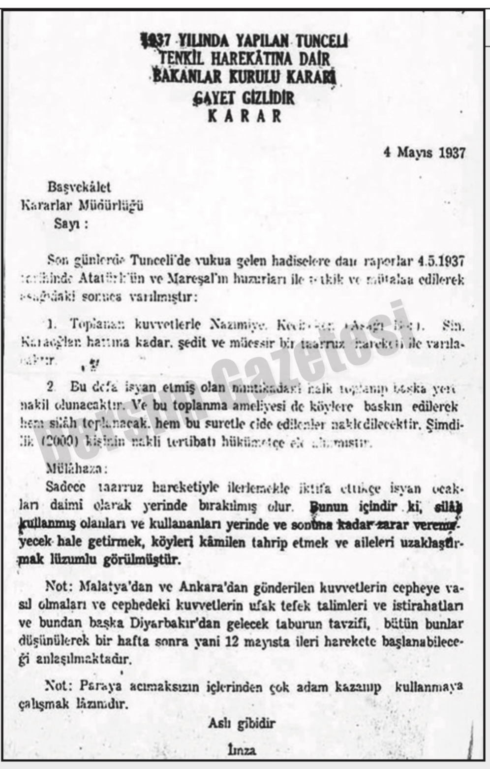 1937 YILINDA YAPILAN TUNCELİ TENKİL HAREKÂTINA DAİR BAKANLAR KURULU KARARI