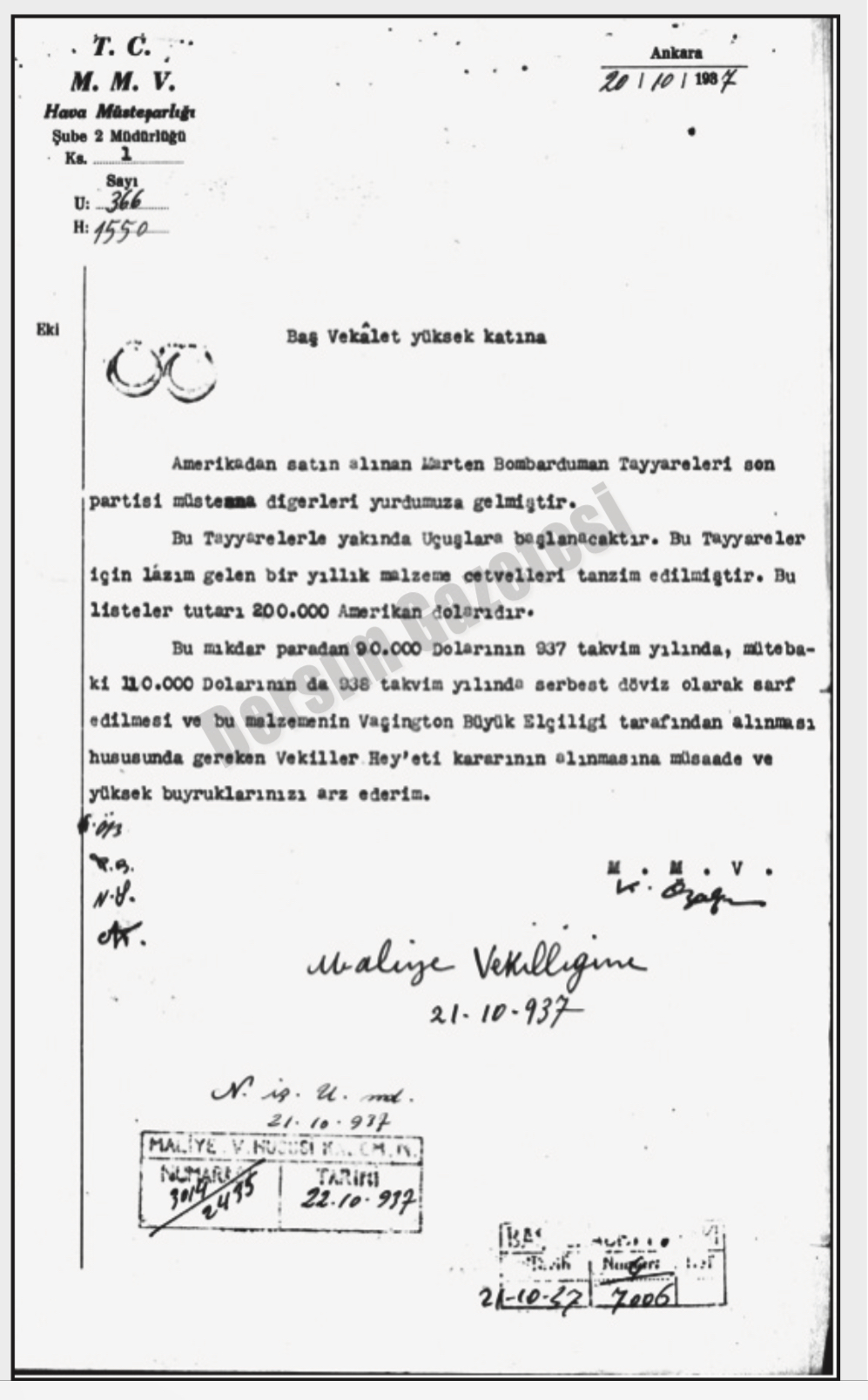 “Amerika’dan satın alınan Marten Bombardıman Tayyareleri son partisi müsteana diğerleri yurdumuza gelmiştir. Bu tayyarelerle yakında uçuşlara başlanacaktır. Bu Tayyareler için lazım olan bir yıllık malzeme cetvelleri tanzim edilmiştir. Bu listeler tutarı 200 bin Amerikan dolarıdır. Bu miktar paradan 90 bin dolarının [1]937 takvim yılında, mütebaki 110 bin dolarının da [1]938 takvim yılında serbest döviz olarak sarf edilmesi ve bu malzemenin Vaşington Büyük Elçiliği tarafından alınması hususunda gereken Vekiller Heyeti kararının alınmasına müsaade ve yüksek buyruklarınızı arz ederim.