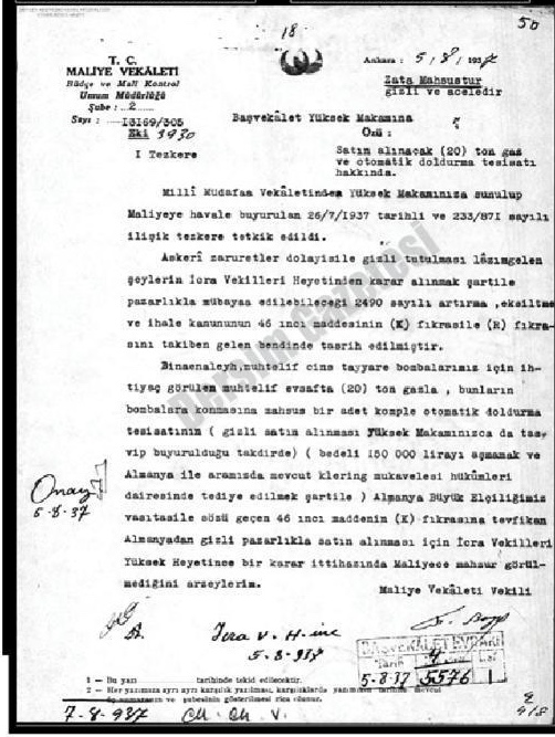 Reisicumhur Kemal Atatürk, Nazi Almanya’sından 20 ton Chloracetophenon ve İperit vs. gazları ve bu gazları bombalara koymaya yarayacak otomatik tesisatları almak için Maliye Bakanlığı’na 26/7/1937 tarihinde 871 sayılı tezkere ile başvurur. Maliye Bakanlığı, o zamanlar ticari ilişkilerin oldukça iyi olduğu Almanya’dan, 150 bin Türk lirasını geçmemek ve takas (klering) usulü ile ve eksiltme ve artırma yoluyla bu gazın alınmasına 5/8/937 tarihinde onay verir.