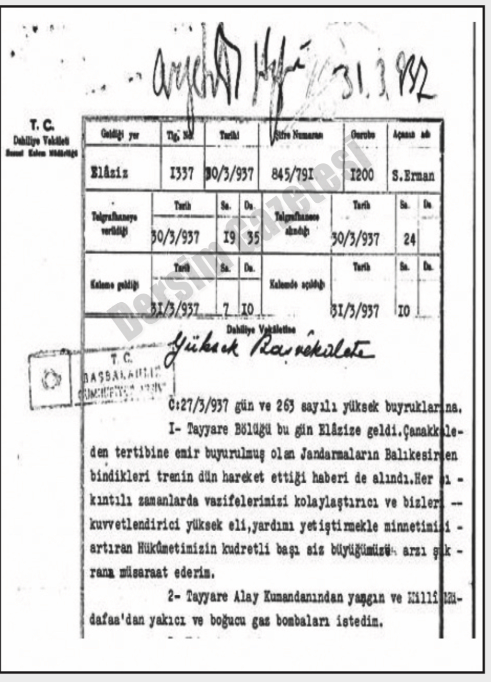 Araştırmacılar Hüsnü Gürbey ve Mahsuni Gül’ün Dersim Gazetesi’nde yayımladığı belgeler ise zehirli gazların 1937 yılında Almanya’dan alındığını kanıtlıyor. İlk belge Dördüncü Umumi Müfettişliğine ait. Müfettişlik Tayyare Alay Kumandanı”ndan yangın, Milli Müdafaa Vekalet’inden de yakıcı ve boğucu gaz bombaları istiyor. Dördüncü Umumi Müfettişi General Alpdoğan, resmi yazışmaların dışına çıkacak şekilde oldukça samimi ve duygusal bir telgrafı Başvekalete (Başbakana) çekiyor ve şunları yazıyor: