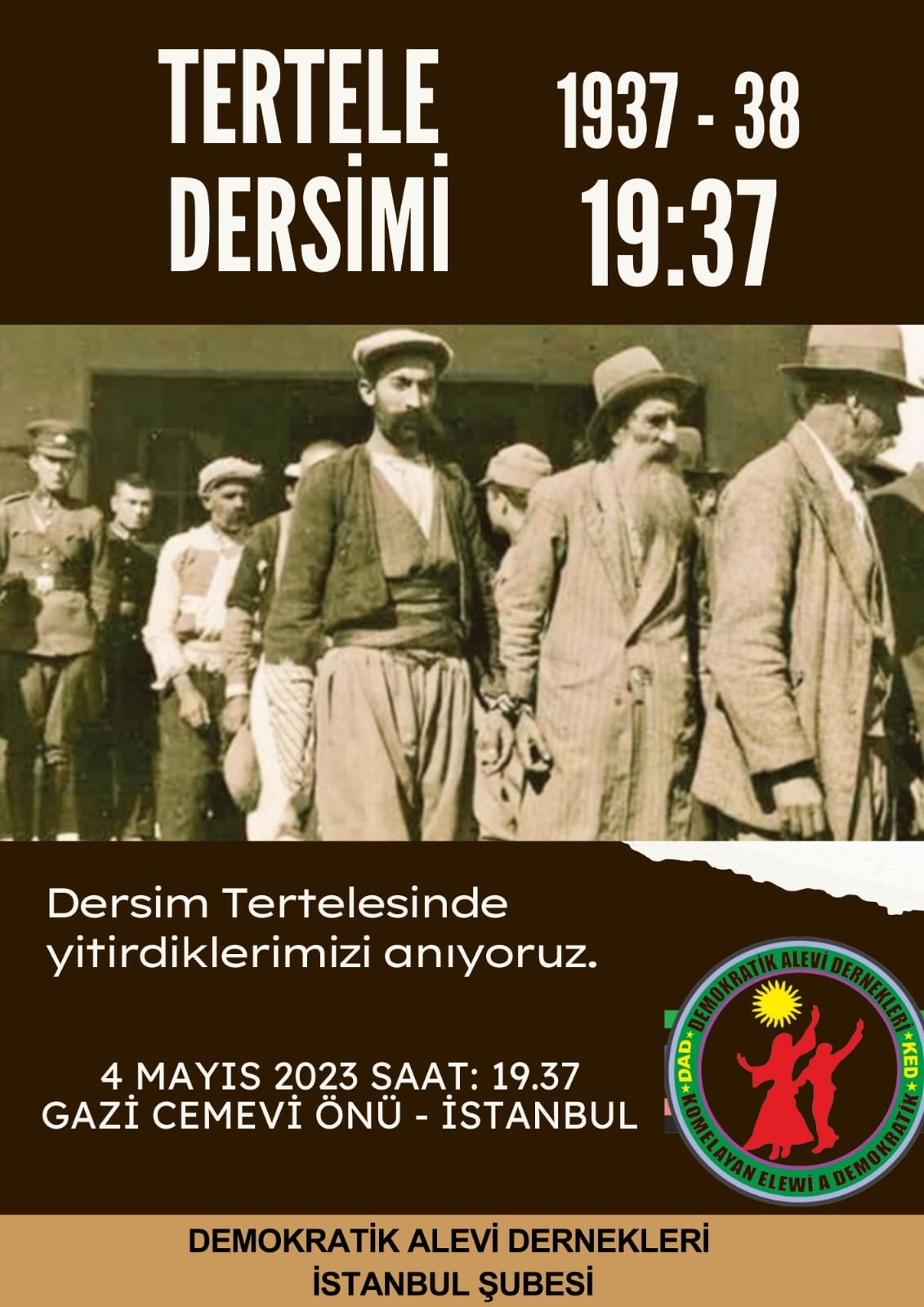 Dersim Dernekleri Federasyonu (DEDEF), Avrupa Demokratik Dersim Birlikleri Federasyonu (ADEF) ve Dersim Araştırmaları Merkezi (DAM) Dersimde katledilen on binlerce masum insanı anmak ve başka 4 Mayısların yaşanmaması için 4 Mayıs 2023 (Saat: 19.37/38 ) Kadıköy Rıhtımda Buluşuyoruz. Anmaya (Roza Şae / Kara Gün ) tüm Dersimli ve Dersim Dostlarını bekliyoruz.”