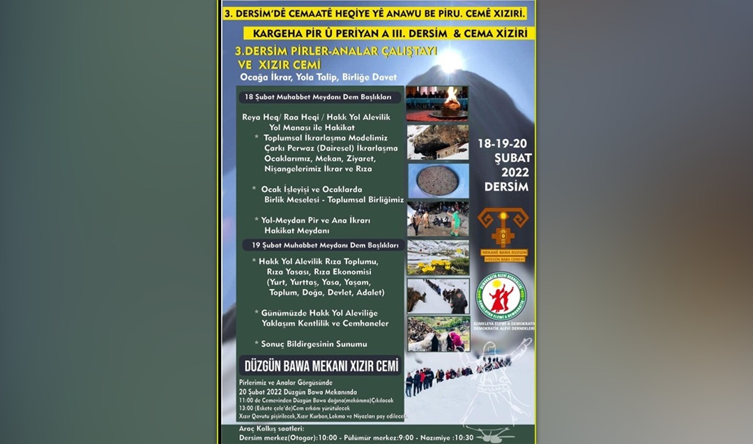 Demokratik Alevi Dernekleri (DAD) ve Düzgün Baba Cemevi ortaklığında Dersim’de 18-19-20 Şubat’ta pirler-analar çalıştayı ve Hızır cemi yapılacak.