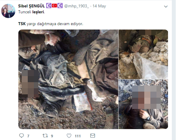 Dersim’de yaklaşık 1 haftadır süren askeri operasyon devam ederken, PKK’lilerle asker ve polisler arasında yer yer çatışmalar yaşanıyor. Çatışmalarda can kayıplarının olduğu belirtiliyor. Çatışmada yaşamını yitirdiği belirtilen PKK’lilere ait olduğu iddia edilen bazı fotoğraflar sosyal medya hesaplarında paylaşıldı. Paylaşılan bazı fotoğraflarda askerlerin cenazelere ayak basarak poz verdikleri, bazı fotoğraflarda ise askerlerin cenazelerin başında bekleyerek toplu fotoğraf çektirdi. MHP Eskişehir İl Yöneticisi Sibel Şengül, fotoğrafları twitter hesabında “Tunceli leşleri, TSK yargı dağıtmaya devam ediyor” sözleriyle paylaştı.