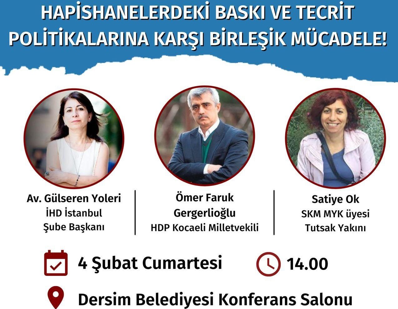 PİRHA-Ezilenlerin Sosyalist Partisi (ESP), Dersim İl Örgütü, 4 Şubat Cumartesi günü saat 14.00’de Belediye Konferans Salonu’nda ‘Hapishanelerdeki baskı ve tecrit politikalarına karşı birleşik mücadele’ konulu panel düzenleyecek.