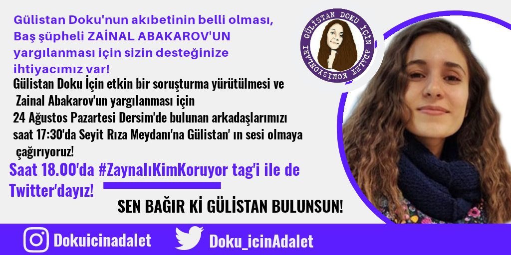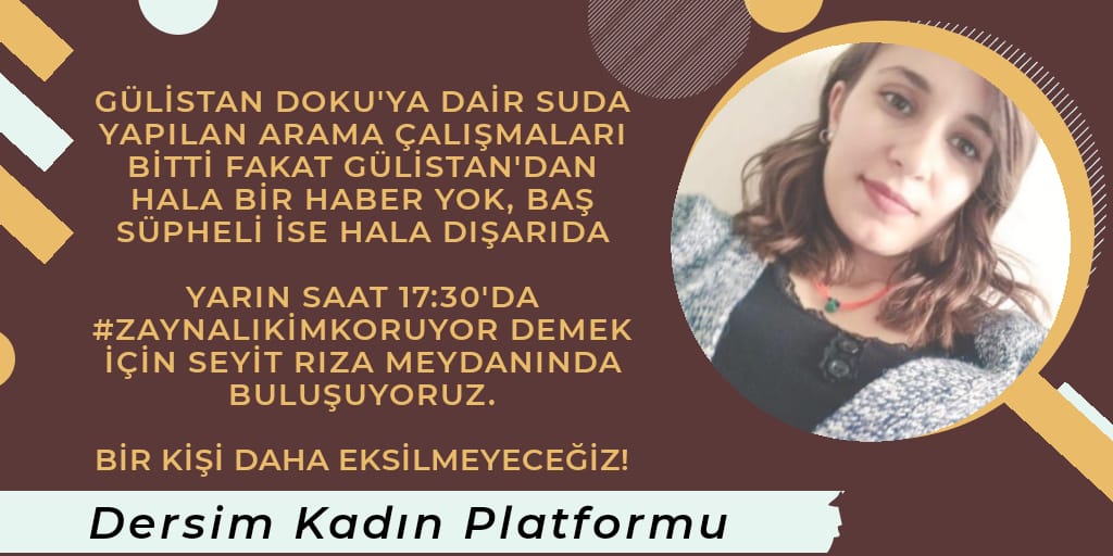 Seyit Rıza Meydanı’nda saat 17.30’da gerçekleşecek eylem sonrası kadınlar Twitter’dan da saat 18.00’de “Sen bağır ki Gülistan bulunsun!” diyerek Gülistan Doku bulunana kadar vazgeçmeyeceklerini duyuracaklar.