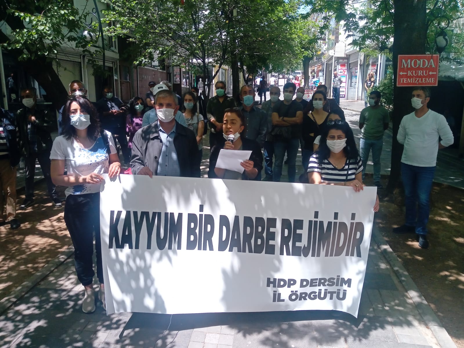 Basın metnini okuyan HDP Dersim İl Eş Başkanı Nurşat Yeşil, “Darbe karşıtı nutukların havada uçuştuğu bugünlerde Saray Rejimi, bütün ırkçı, vesayetçi, darbeci ortaklarıyla beraber 5 yıldan beridir sürdürdükleri kayyım gasp rejimini Siirt, Iğdır, Altınova, Baykan ve Kurtalan belediyelerine el koyarak sürdürmüştür. Halk iradesinin gasp edilmesini salgın hastalık, hukuk, kural, kaide dinlemeden devam ettiren bu rejim, başta Kürt halkı olmak üzere Türkiye halklarının seçme ve seçilme iradesine saldırmaya devam etmektedir. Dünyayı kasıp kavuran Korona salgınında bile belediyeler eliyle yardımları engelleyen, halkın dayanışma duygusunu çökertip çaresiz kılmak isteyen tekçi rejim, bütün engellemelere rağmen halkın yanında yer alan belediyelerimize darbe dönemlerini aşan bir biçimde el koymuştur.