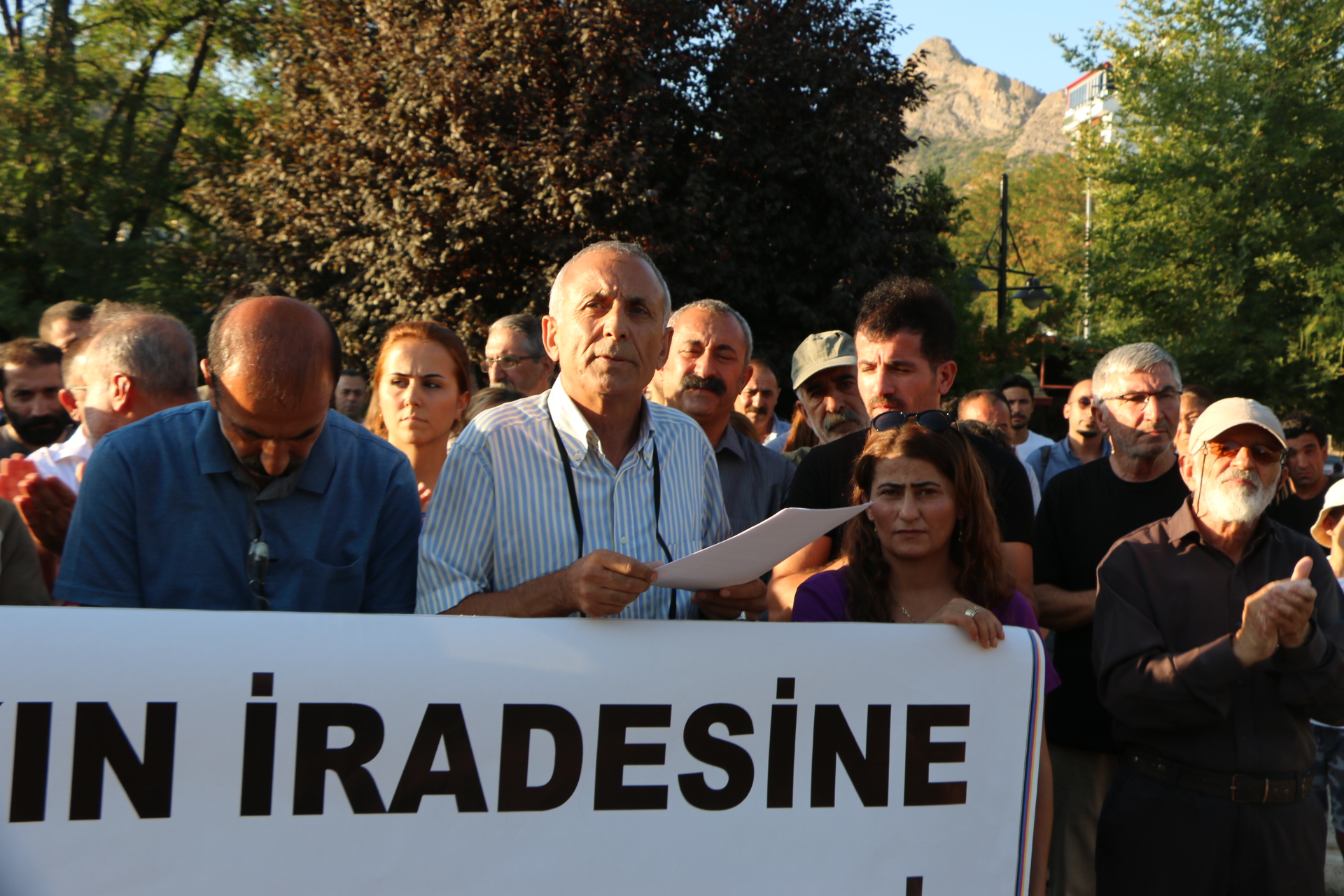 Açıklamada konuşan İnsan Hakları Derneği Dersim Şube Başkanı Gürbüz Solmaz, “2016 yılında HDP’li belediyelere yönelik yapılan baskınlar sonucu halkın iradesine el konulmuştu. 31 Mart seçimlerinde HDP belediyelerine yönelik kayyum açıklamaları oluyordu. Ne yazık ki bugün; kayyumla halkın iradesi gasp edildi. Bu tür uygulamaları kınıyoruz, halkın iradesi gasp edilemez. Dersim başta olmak üzere bölgede yapılan baskınlarda gözaltına alınan arkadaşlarımız serbest bırakılsın” ifadelerini kullandı.