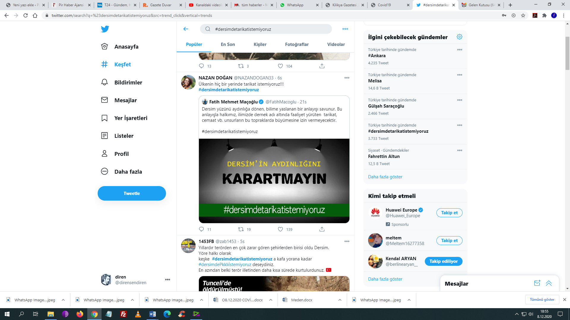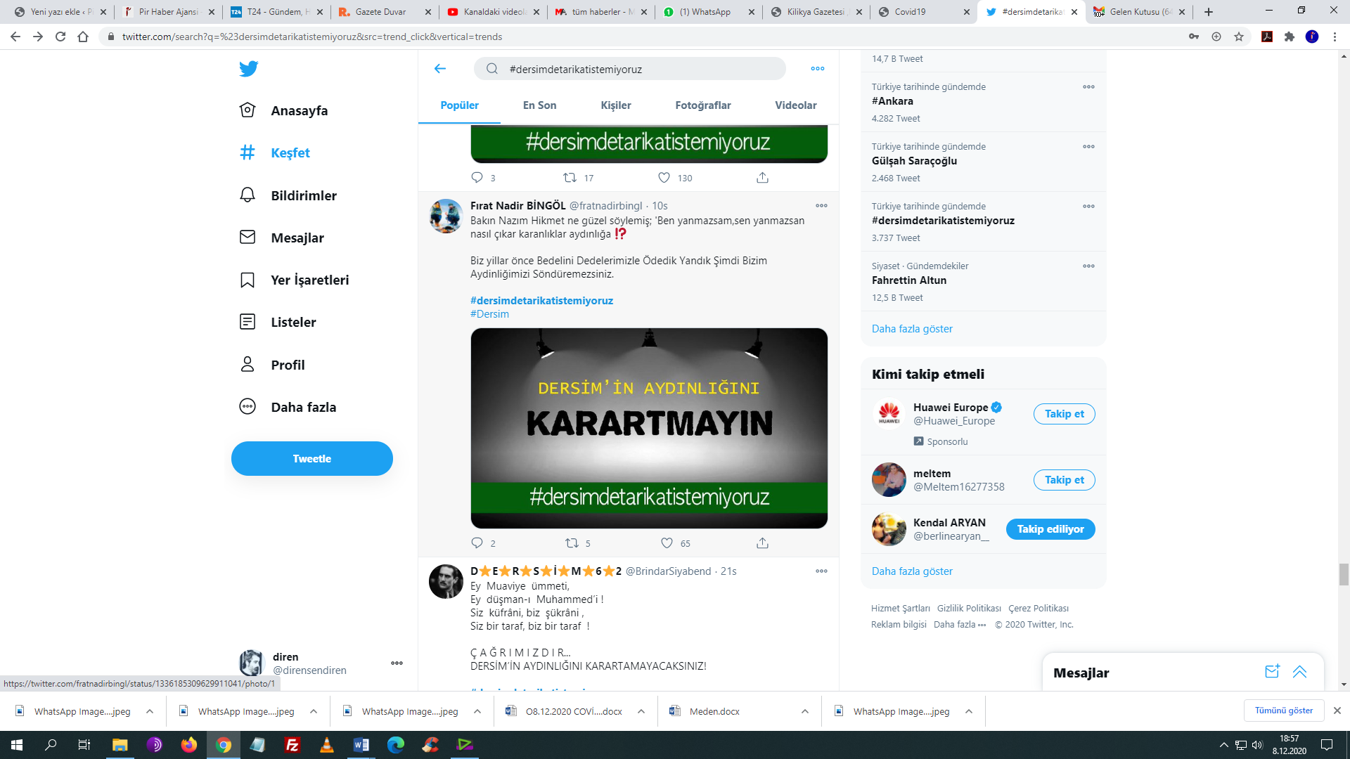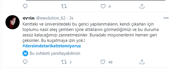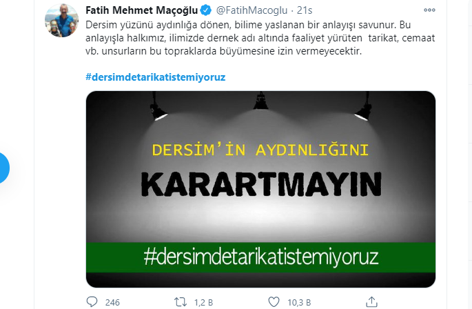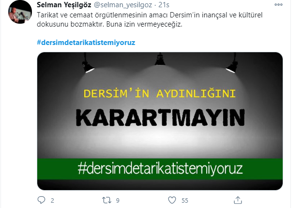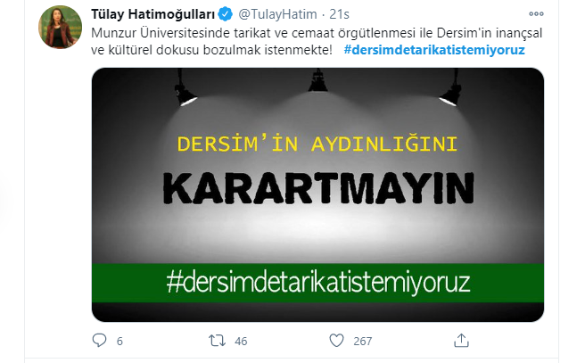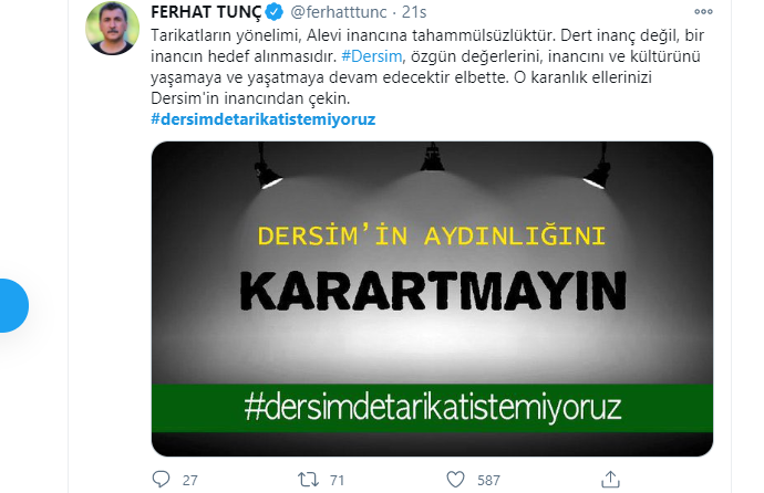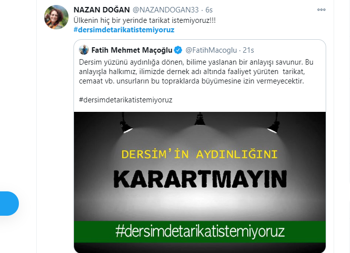 Sosyal medya üzerinden açılan #dersimdetarikatistemiyoruz Hastang ile siyasetçiler, yazarlar, sanatçılar, kurumlar ve yurttaşlar tepkilerini dile getirdi.