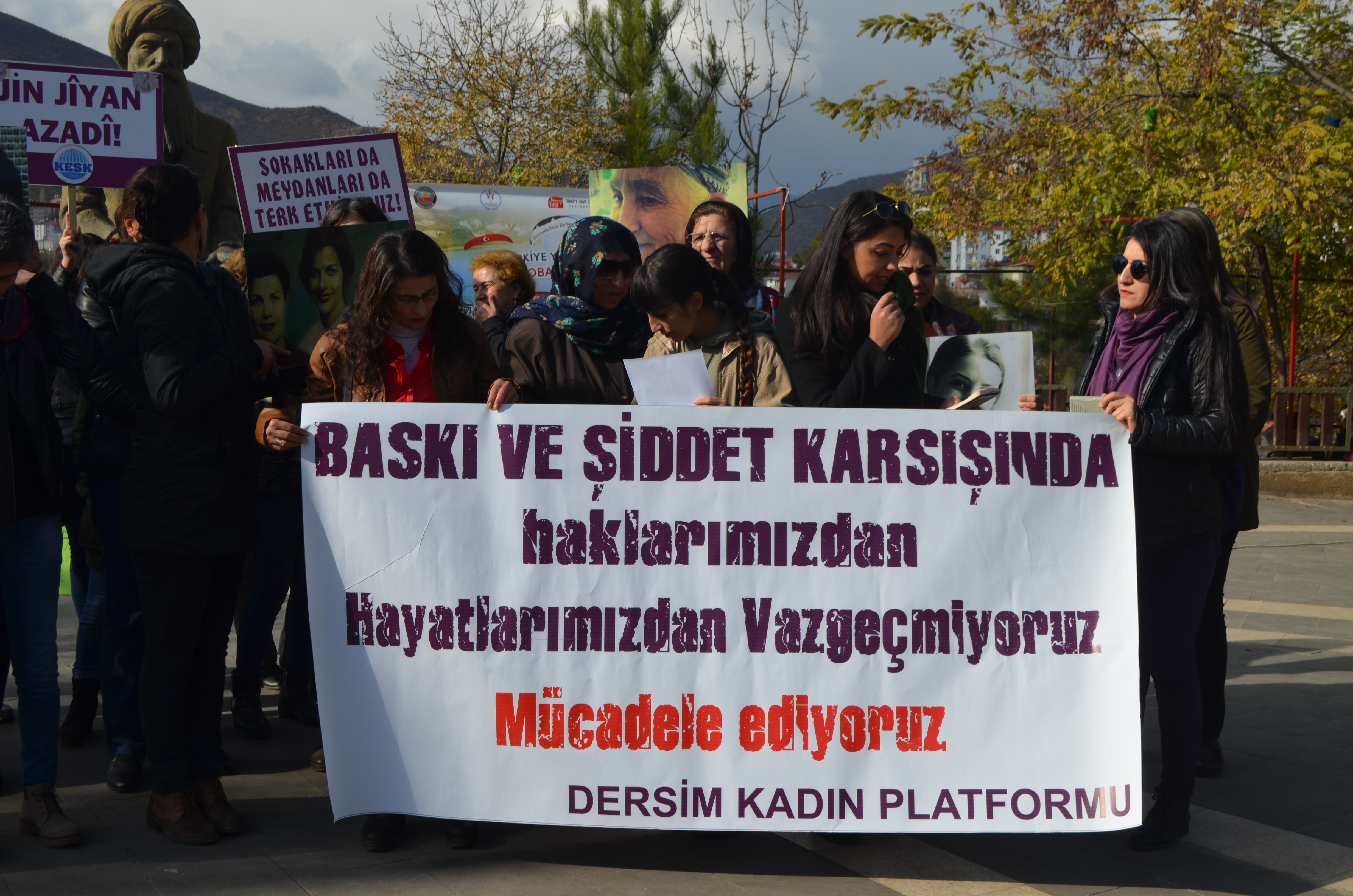 Kadın örgüleri, siyasi partiler ve emek örgütlerinden oluşan Dersim Kadın Platformu, Seyit Rıza Meydanı’nda 25 Kasım Kadına Yönelik Şiddete Karşı Uluslararası Mücadele Günü dolayısıyla basın açıklaması yaptı.