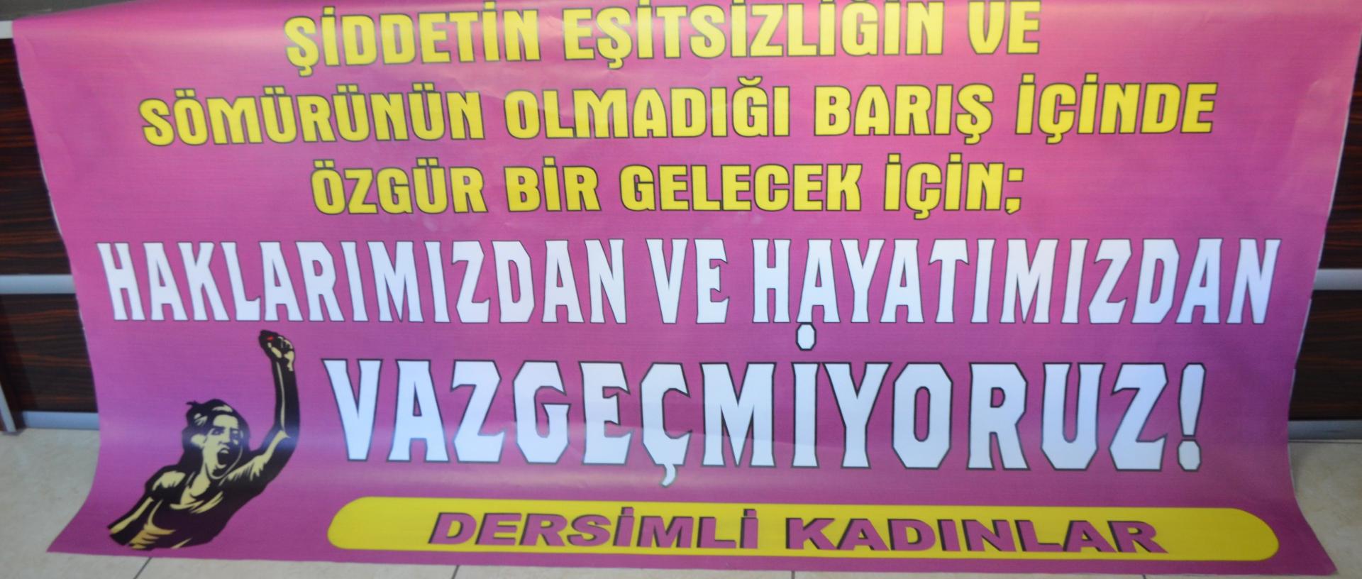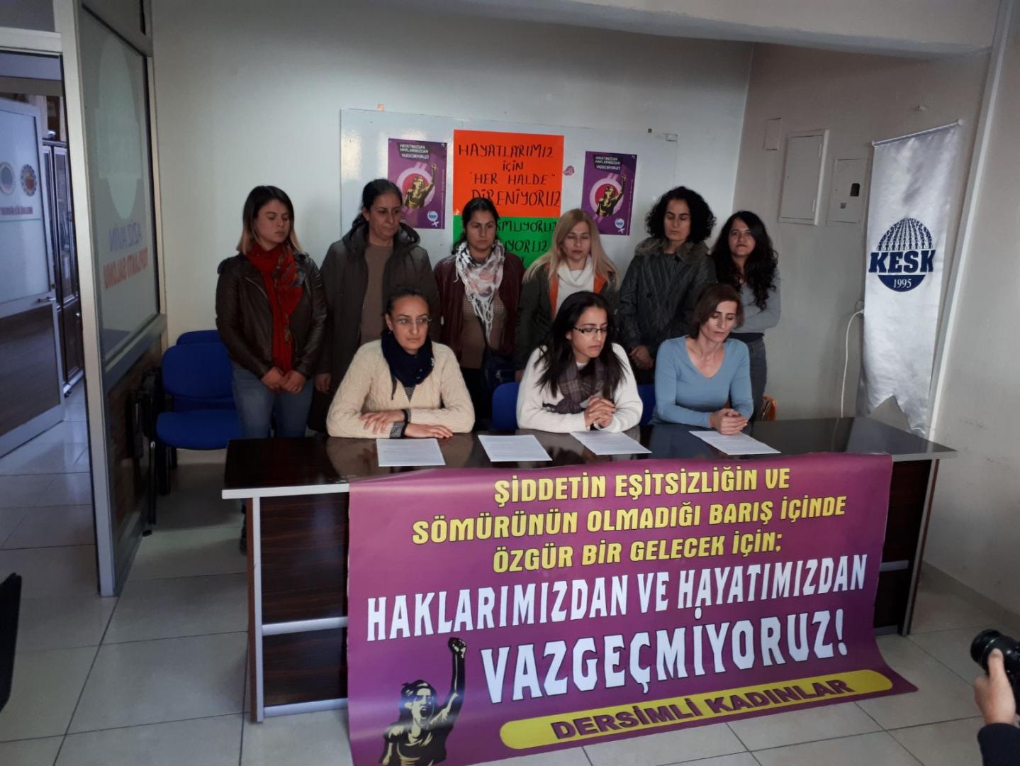 Dersimli kadınlar 25 Kasım Kadına Yönelik Şiddetle Uluslararası Mücadele ve Dayanışma Günü’nde basın açıklaması gerçekleştirdiler. Açıklamaya EMEP, ESP, Demokratik Kadın Hareketi ve Disk Genel-İş sendikası temsilcileri katıldı. Açıklamayı okuyan SES Dersim Şubesi Eş Başkanı Nurşat Yeşil öncesinde bir konuşma yaptı. Yeşil, “Açıklamamızı açık havada Seyit Rıza Meydanı’nda yapmak için valiliğe başvurduk. Valiliğin, başvuran arkadaşımızın ihraç edilmesi ve devlet memuru olmaması üzerine başvuruyu değerlendirmeye almadıklarını bildirdiğini ifade eden Yeşil, biz Salı günü başvuru yaptık valilik bize Çarşamba günü durumu bildirseydi başkası üzerinden başvuruyu yapıp, eğer izin vermek gibi bir niyetleri olsaydı böyle bir girişimde bulunabilirlerdi diye düşünüyorum” dedi.