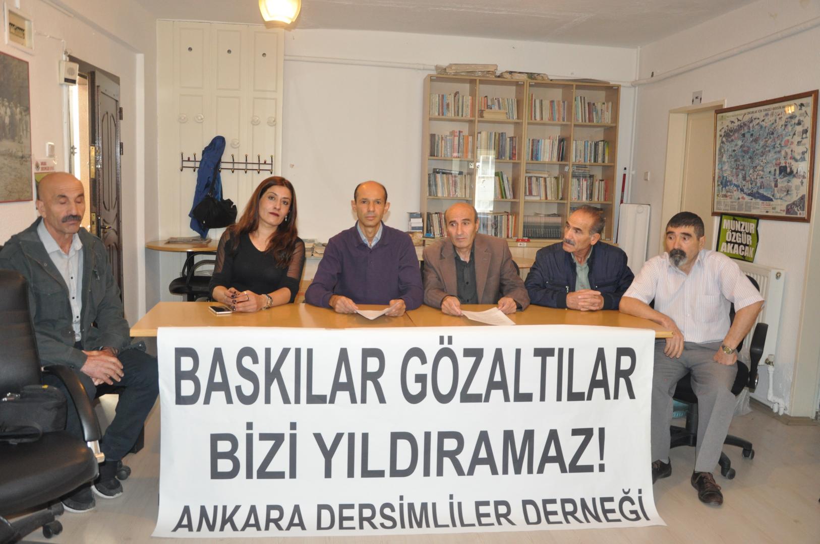 Dersimliler Derneği Ankara Şubesi önceki gün gözaltın alınan şube başkanları için basın açıklaması yaptı. Basın açıklamasına Hacı Bektaş Veli Anadolu Kültür Vakfı, Demokratik Alevi Derneği, Divriği Kültür Derneği, Kızılırmak Köy Dernekleri Federasyonu, Pülümür Sağlamtaş Köyü Derneği ve Dersim Mağdurları Platformu katıldı. Açıklamayı Dersimliler Derneği Ankara Şube Başkanı Ali Ekber Çelik okudu. Çelik yaptığı açıklamada, önceki gün dernek üyelerinin hiçbir gerekçe gösterilmeden Bursa’da sabahın erken saatlerinde evine baskın yapılarak gözaltına alındıklarını söyledi.