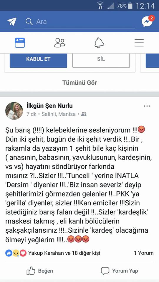 “CHP Manisa Milletvekili Mazlum Nurlu’nun eşi Avukat İlkgün Şen Nurlu sosyal medya hesabından özelde Dersim’i genelde barış yanlısı demokratik güçlerini hedef alarak çirkin bir paylaşımda bulunmuş, saatler sonra gelecek tepkilerden çekinmiş olacak ki paylaşımı alelacele kaldırmıştır. Söz konusu paylaşım şöyledir: ‘Şu barış kelebeklerine sesleniyorum. Dün iki şehit, bugün de iki şehit verdik. Bir, rakamla da yazayım 1 şehit bile kaç kişinin (anasının, babasının, yavuklusunun, kardeşinin vs.) hayatını söndürüyor farkında mısınız ? Sizler !!! ‘Tunceli’ yerine inatla ‘Dersim’ diyenler. Biz insan severiz deyip şehitlerimizi görmezden gelenler. PKK’ya gerilla diyenler sizler !!! Kan emiciler! Sizin istediğiniz barış falan değil. Sizler kardeşlik maskesi takmış eli kanlı bölücülerin şakşakçılarısınız. Sizinle kardeş olacağıma ölmeyi yeğlerim.'”