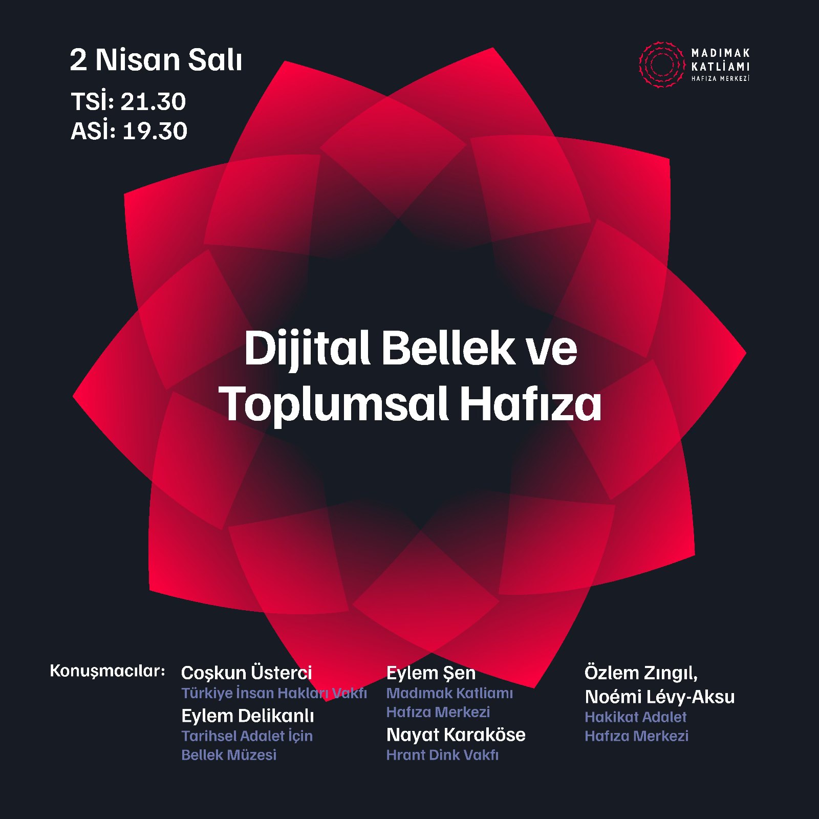Bugün (2 Nisan) Türkiye saati ile 21.30, Avrupa saati ile 19.30’da X’te açılacak sohbet odasında ‘Dijital Bellek ve Toplumsal Hafıza’ konulu söyleşiye Türkiye İnsan Hakları Vakfı’ndan Coşkun Üsterci, Tarihsel Adalet için Bellek Müzesi’nden Eylem Delikanlı, Madımak Katliamı Hafıza Merkezi’nden Eylem Şen, Hrant Dink Vakfı’ndan Nayat Karaköse, Hakikat Adalet Hafıza Merkezi’nden Noémi Lévy-Aksu ve Özlem Zıngıl katılacak.