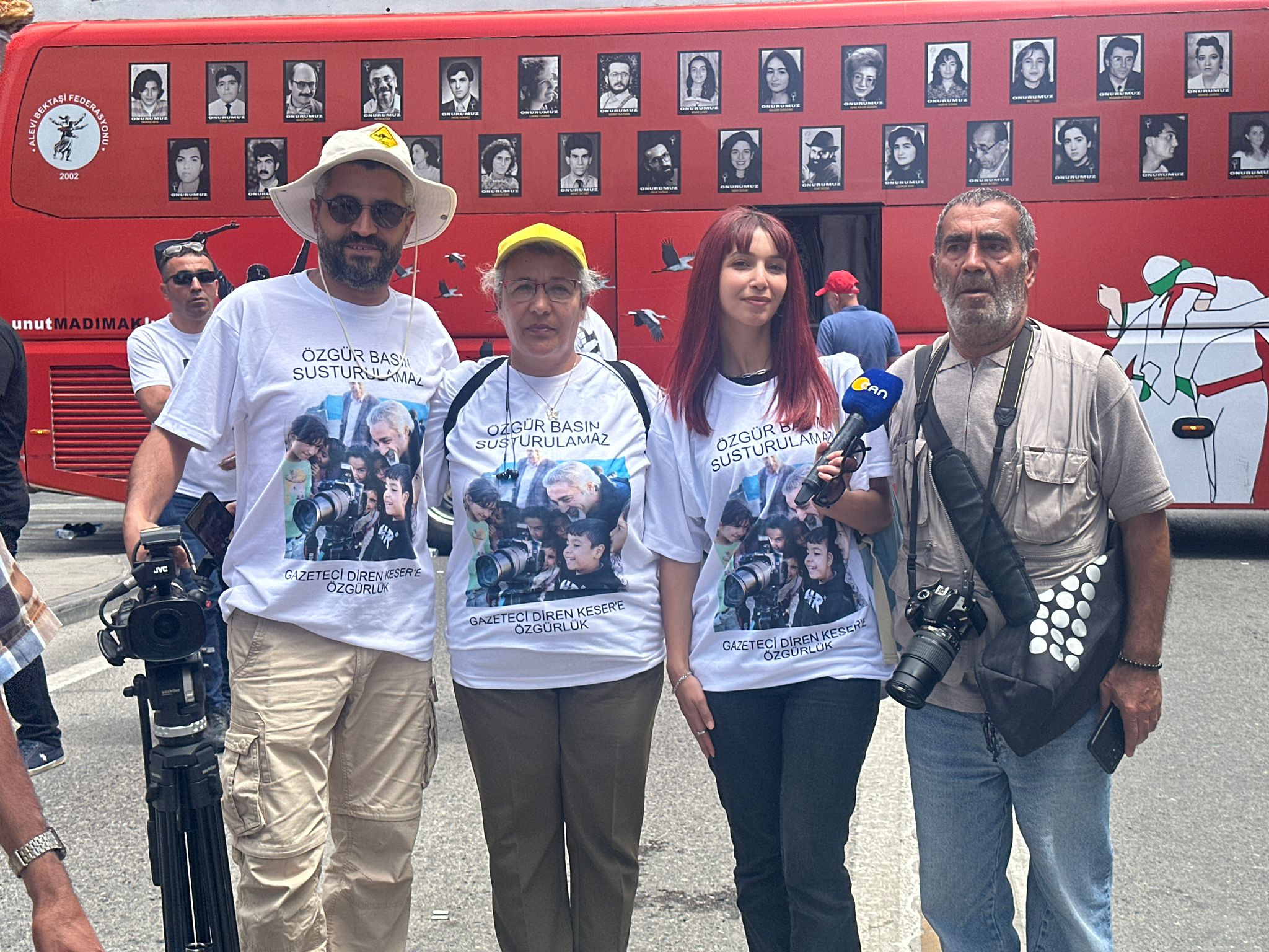 PİRHA- Sivas’ta gerçekleştirilen Alevi Katliamı’nın protesto edildiği Madımak Oteli önünde anmayı izleyen muhabir ve kameraman arkadaşlarımız, tutuklu muhabirimiz Diren Keser’in fotoğrafının basılı olduğu tişörtleri giyindi. Arkadaşlarımız, Diren Keser’in bir an önce özgürlüğüne kavuşması gerektiğine işaret ettiler.