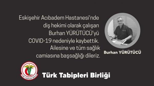 Türk Tabipleri Birliği, “Eskişehir Acıbadem Hastanesi’nde Diş Hekimi olarak çalışan Dt. Burhan YÜRÜTÜCÜ’yü COVİD-19 nedeniyle kaybettik. Ailesine ve tüm sağlık camiasına başsağlığı dileriz” dedi.