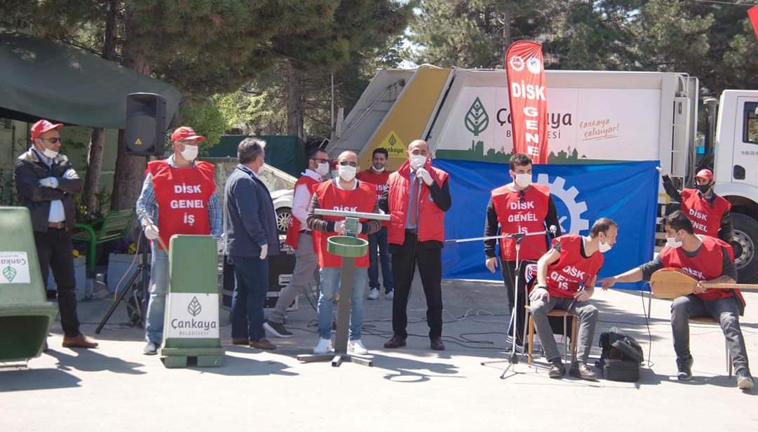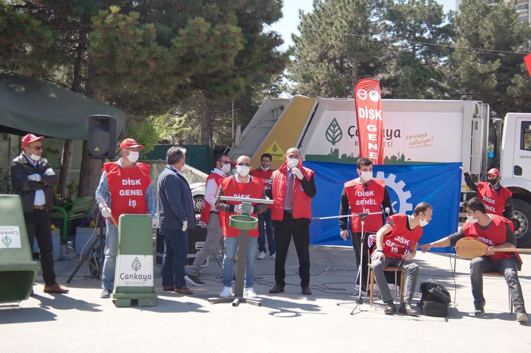 PİRHA-DİSK/Genel İş Sendikası, Çankaya Lozan Park içiresinde 1 Mayısla ilgili basın açıklaması yaptı. Açıklamada, işçiler arasında Covid-19 pozitif oranın ülke ortalamasının üç katı oldu vurgulanırken, “Salgına karşı belediye işçilerini koruyun” denildi.