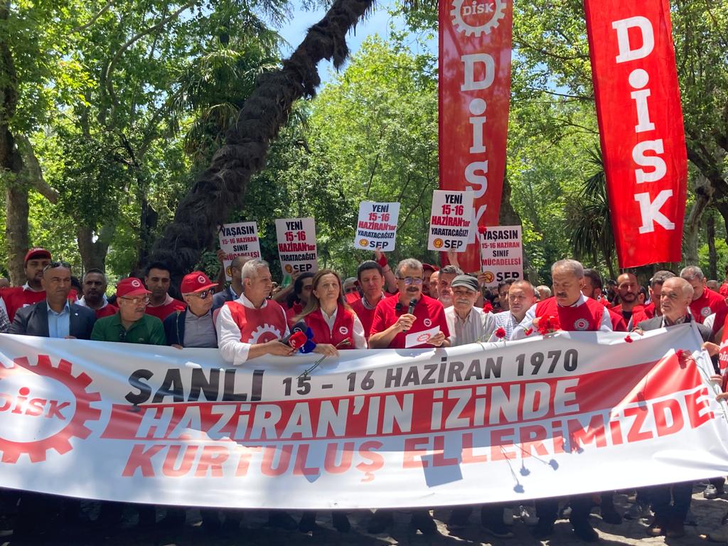 “Yaklaşık yarım asır önce DİSK’in kapatılması girişimlerine karşı ayağa kalkan işçi sınıfı, 15-16 Haziran 1970’te yaşamı durdurmuş, şalterleri indirerek alanları doldurmuştu. İşçiler sendikalarını ve örgütlenme haklarını direne direne savunmuştu.