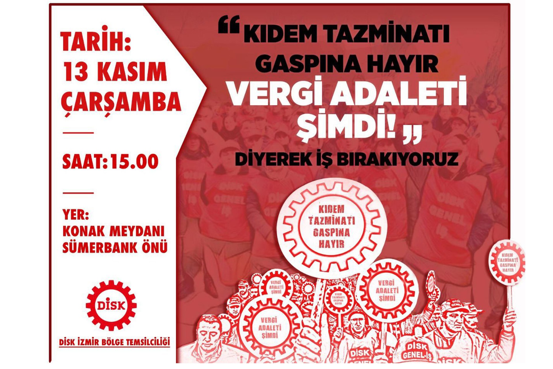 DİSK Ege Bölge Temsilciliği ve bağlı sendikalar “Kıdem tazminatı gasbına hayır, vergi adaleti şimdi” sloganıyla bugün (13 Kasım) iş bırakma eylemi gerçekleştirecek.