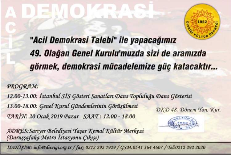 PİRHA- Divriği Kültür Derneği “Acil demokrasi talebi” ile 49. Olağan Genel Kurulu’nu 20 Ocak Pazar günü Sarıyer Belediyesi Yaşar Kemal Kültür Merkezi’nde yapacak.