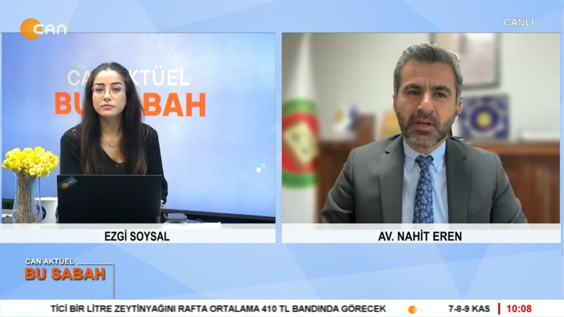 Diyarbakır Barosu Başkanı Avukat Nahit Eren, CAN TV’de yayınlanan Ezgi Soysal’ın sunduğu Can Aktüel Bu Sabah programında konuya dair değerlendirme yaptı.