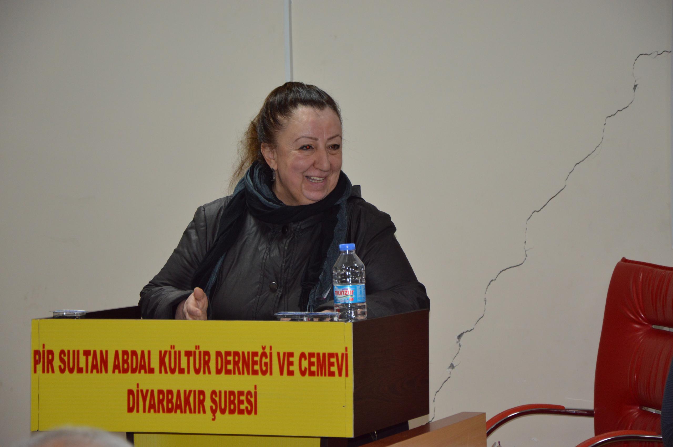 “Kadınlar kenara, arkaya sıkışıp izlemezlerdi. En ön saflardaydılar. Zamanla kadınlar ‘Ata binemez, cem yürütemez’, ‘Kadınlar deveye binemez, o yüzden bir yerden bir yere gidemez’ oldu. Tıpkı Cumhuriyet tarihindeki o kadınlar ata binemediği için kaymakam olamaz zihniyetiyle aynı. Git gide peyder pey kadınların önü kesildi. Biz kadınlar olarak bundan çok mustaribiz. Alevi kadınları olarak özellikle en ön saflarda yer almaları gerektiğine inanıyorum. Demem o ki kadınların ve erkeklerin eşit olduğu anlayışı Alevilerde var ama pratikte bu gerçekten azalmış durumda. Teoride var ‘eşitiz’ diyoruz ama pratikte bu yok denecek kadar aza indirgenmiş durumda. Bundan biz kadınlar olarak mustaribiz. ‘Kadın-erkek eşittir’ demekle kadın-erkek eşit olmuyor, onu gördük. Avrupa’daki Aleviler (AABF) eşit başkanlık sistemine geçtiler, biz de en kısa zamanda geçmek istiyoruz. Kadınlar olarak bizler de yönetimde söz sahibi olmak istiyoruz.”