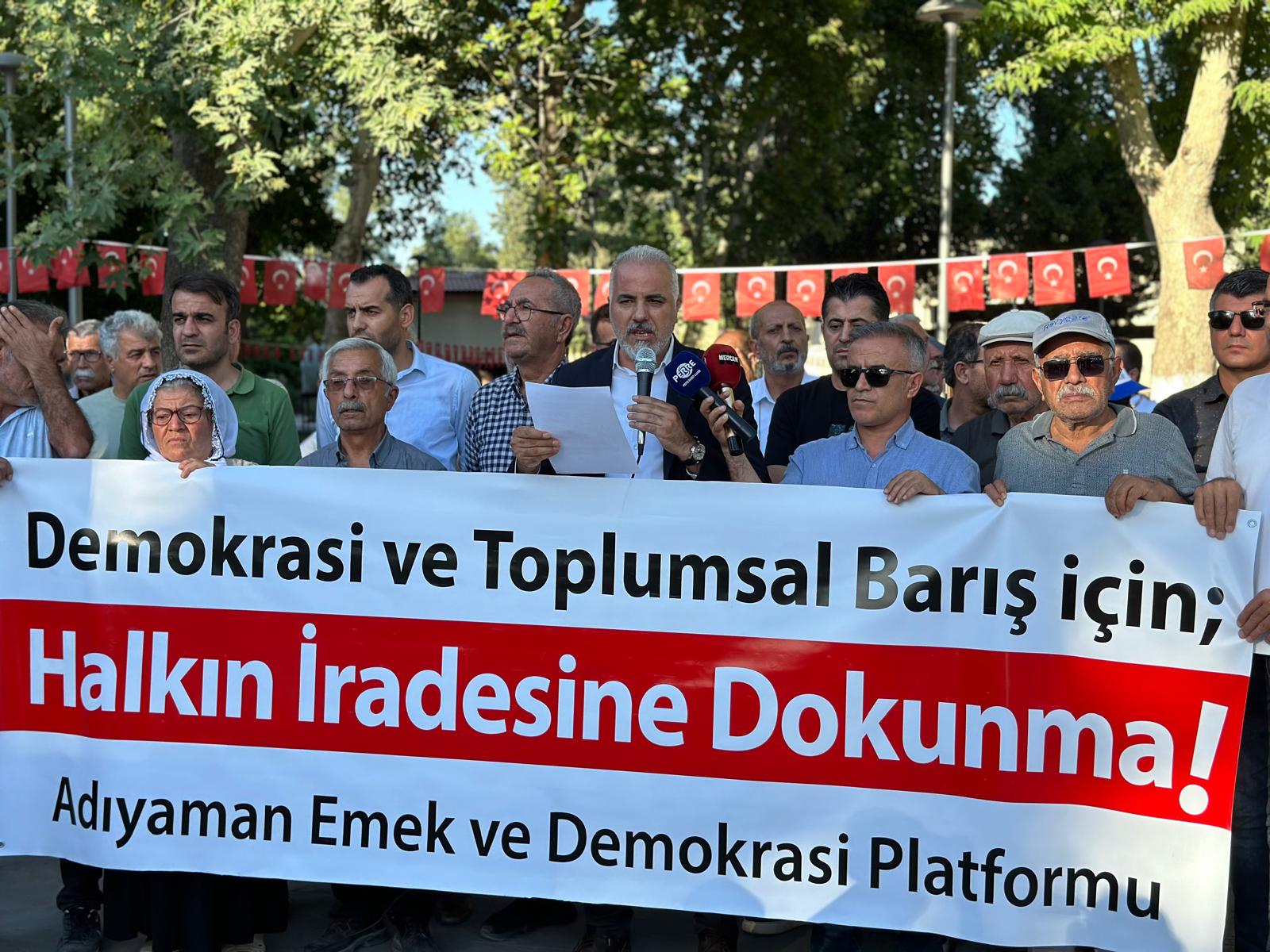 Açıklamayı okuyan Adıyaman Baro Başkanı Avukat Bilal Doğan, “Halk iradesine vurulan bu darbeden derhal vazgeçilmelidir. Hukuk dışı yollarla, baskı ve zor yöntemleriyle halkın iradesinin gasp edilmesine son verilmelidir. Seçilmiş Hakkâri Belediye Eş Başkanı derhal görevine iade edilmelidir” açıklamasında bulundu.