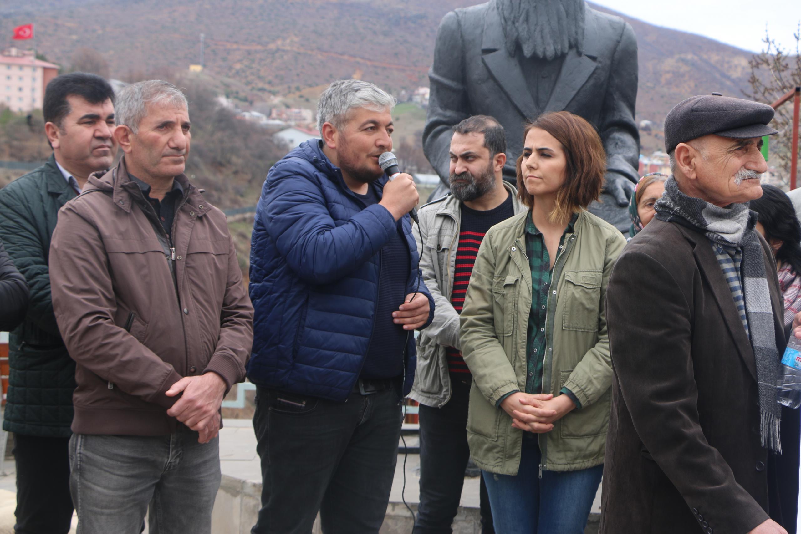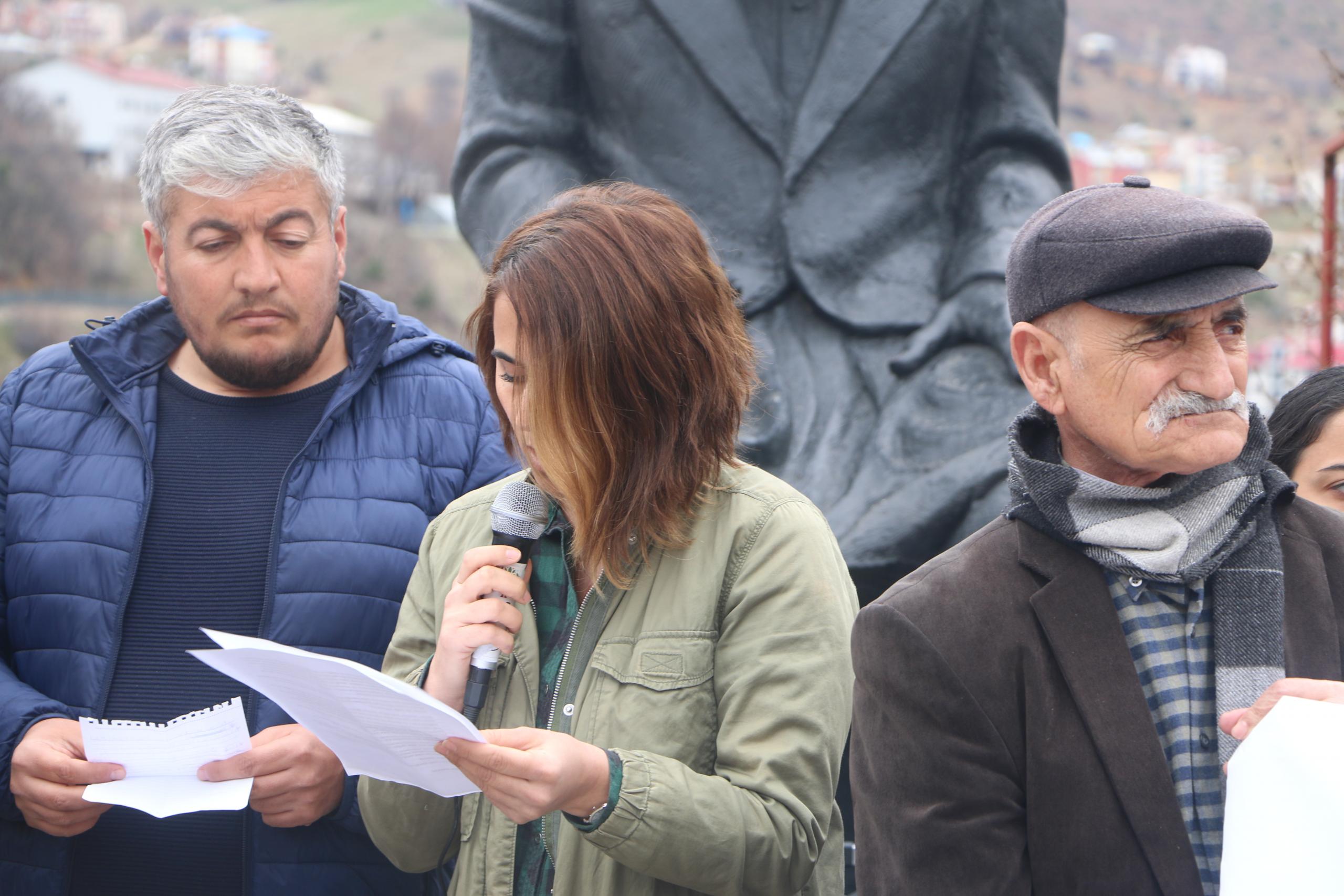 Doğan, “Bugün burada bir kez daha “belirli gün ve haftaları” hatırlatmaya, Dersim’in çığlığını haykırmaya ve doğamız için yan yana olduğumuzu duyurmaya geldik. Yerli ve uluslararası şirketler, ülkemizin dört bir yanında ormana, suya, doğaya karşı büyük bir yağma hareketi yürütüyorlar. Dersim olarak biz de “payımıza” düşeni fazlasıyla alıyoruz. Dersim son yılların en ağır ve yoğun saldırılarıyla karşı karşıya… Hükümet ve sermaye, onca yargı kararlarına rağmen baraj ve HES yapımı için ısrarını sürdürmeye devam ediyor. Yaz aylarında operasyonlardan sonra yakılan ormanlar, birçok alanda maden ve taş ocağı faaliyetleri, ıslah ve sulama kanalı bahanesiyle tahrip edilen dereler, inancımıza zerre tahammülü olmadığı halde düzenlenmek istedikleri Munzur Gözeler peyzaj düzenlemesi, turizm ve av sporu bahanesiyle canlı cansız varlıklara yönelik saldırı, son olarak da kiralanma bahanesiyle büyük şirketlere peşkeş çekilmek istenen araziler ve bitirilmek istenen küçük aile çiftçiliği” ifadelerini kullandı.