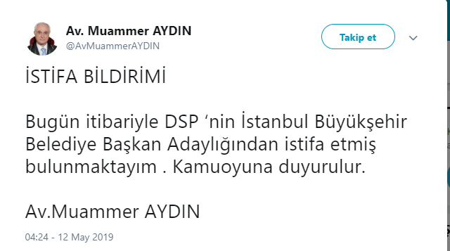 31 Mart’ta 30 bin 817 oy alan Aydın, Twitter hesabından ‘İSTİFA BİLDİRİMİ’ başlığı ile şu açıklamayı yaptı: “Bugün itibariyle DSP’nin İstanbul Büyükşehir Belediye Başkan Adaylığından istifa etmiş bulunmaktayım. Kamuoyuna duyurulur.”