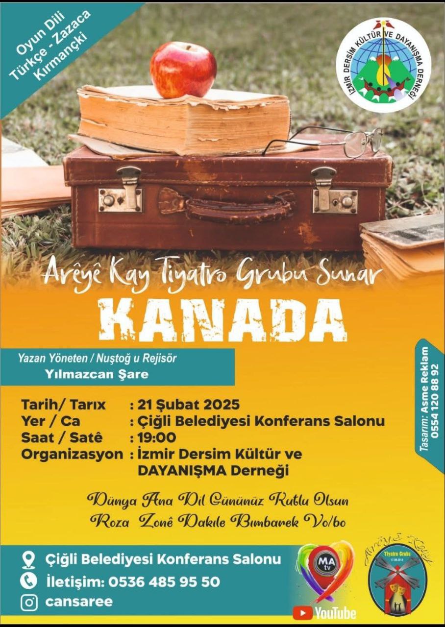 21 Şubat Dünya Ana Dili Günü’nde farkındalık yaratmak amacıyla İzmir’de Arêyê Kay Tiyatro Grubu’nun katılımıyla Kırmancki/Zazaca tiyatro oyunu sahnelenecek.