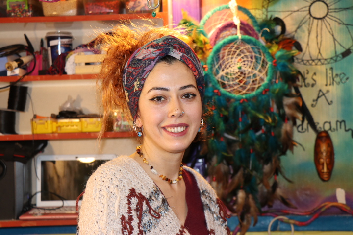 PİRHA- İzmir’in en işlek caddelerinden bir olan Sevgi Yolu’nda renkleri ve desenleriyle dikkat çeken ‘Düş Kapanı’ standında el emeği ürünlerini satan Sevilay Akduman, ekonominin bozulmasından şikayet ederek daha çok natürel çalışmalara önem verdiğine dikkat çekiyor. Akduman, evlerde dekoratif olarak kullanılan ve Kızılderili kültüründe kötü rüyaları kovduğuna inanılan düş kapanını yaparken doğayla alış veriş içinde olduğunu da ekliyor.