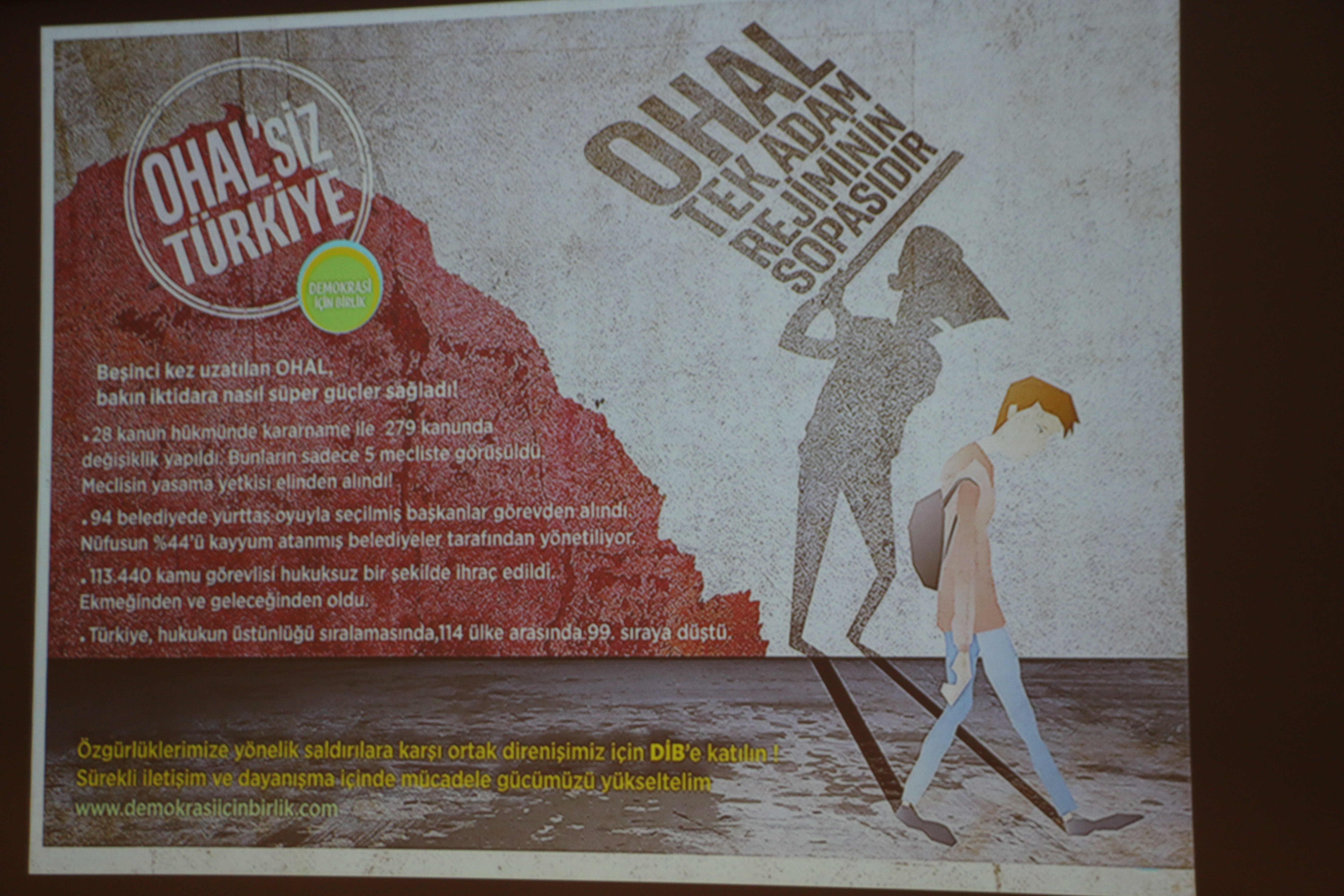 Türmen’in konuşmasının ardından DİB üyesi Nesrahan Davutoğlu konuştu. Davutoğlu, kampanya detaylarını sunum şeklinde aktardı. Davutoğlu, “Herkesi DİB ile iletişim halinde olmaya çağırıyoruz. Sokaklarda kentlerde kasabalarda, köylerde her ortamda tepkimizi bu iletişimle dile getireceğiz. Demokrasi için ilk adımın OHAL’siz bir Türkiye olduğuna inanıyoruz. Neredeyse bir yaşam biçimi halini alan ve 6’ncı kez uzatılması planlanan OHAL kaldırılmalıdır. Çünkü OHAL; Meclisi, hukuk sistemini ve tüm demokratik mekanizmaları hayatımızdan çıkardı. Sonunda tek adam rejiminin sopası haline getirildi” dedi.
