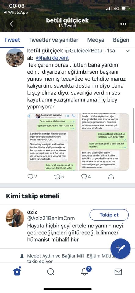 Eğitim-Bir-Sen Diyarbakır 1 Nolu Şube Başkanı Yunus Memiş’in taciz- tecavüz- ölüm tehditlerine maruz kaldığını ve Cumhuriyet Başsavcılığı’na yaptığı başvurusunun yanıtsız kaldığını belirten Betül Gülçiçek adlı kadın, sosyal medyadan yaptığı paylaşımlarla yardım talebinde bulundu.