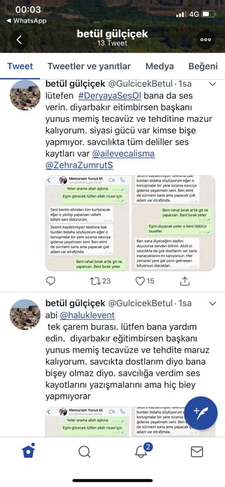 Eğitim-Bir-Sen Diyarbakır 1 Nolu Şube Başkanı Yunus Memiş’in taciz- tecavüz- ölüm tehditlerine maruz kaldığını ve Cumhuriyet Başsavcılığı’na yaptığı başvurusunun yanıtsız kaldığını belirten Betül Gülçiçek adlı kadın, sosyal medyadan yaptığı paylaşımlarla yardım talebinde bulundu.
