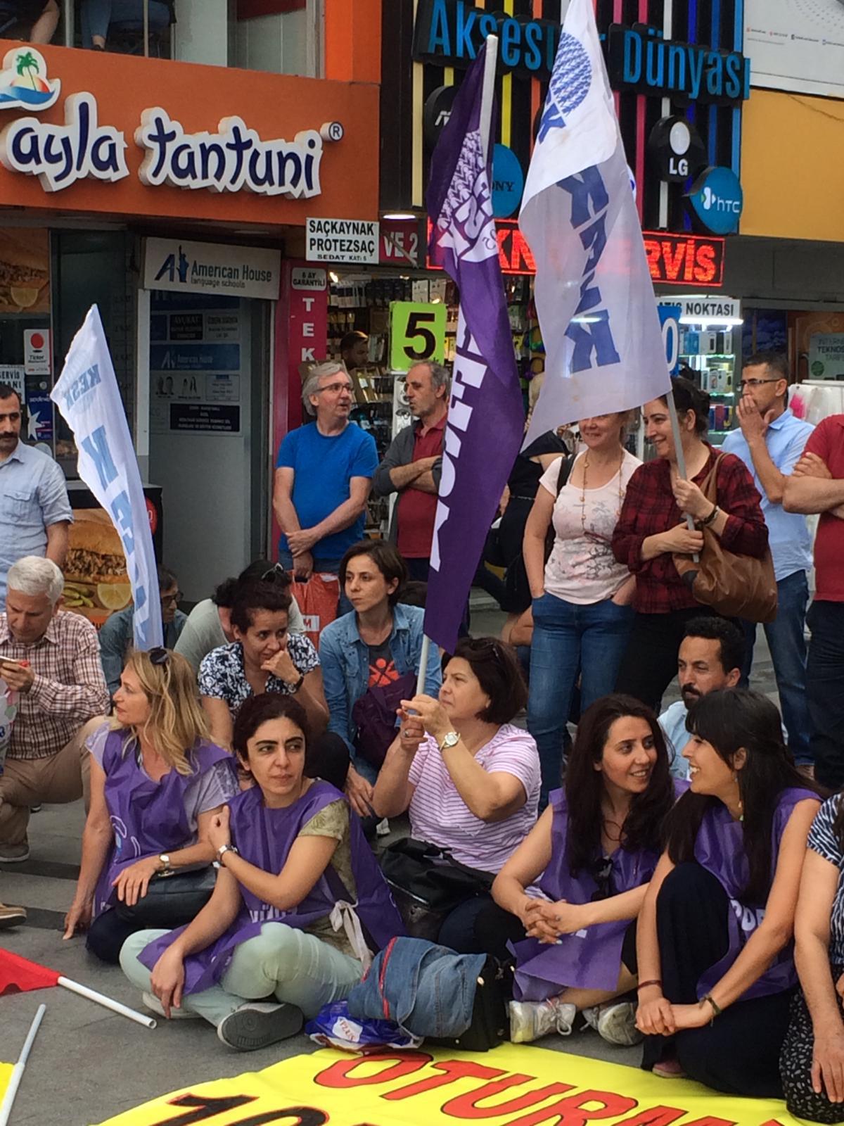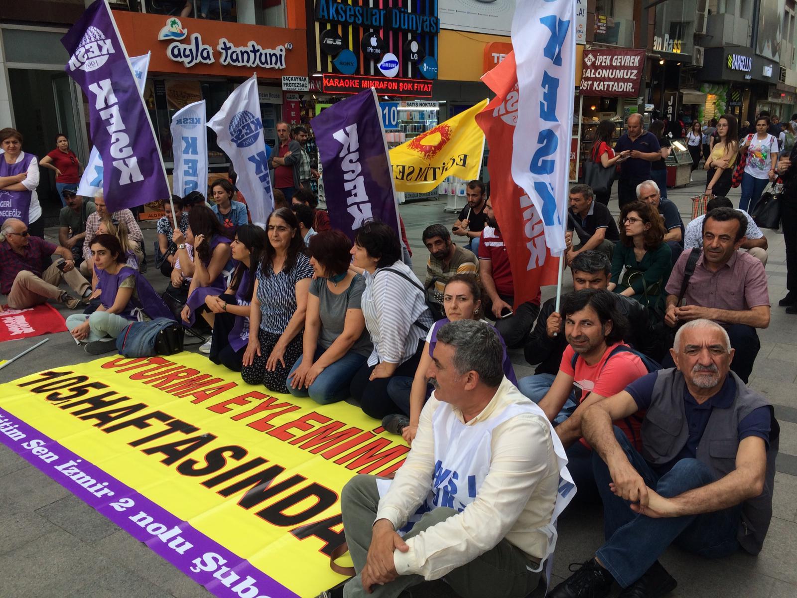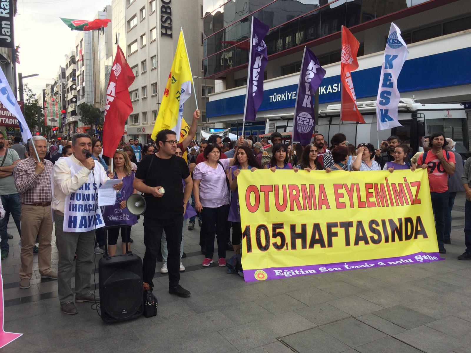 Kamu Emekçileri Sendikaları Konfederasyonu (KESK) İzmir Şubeler Platformu, OHAL kapsamında çıkarılan Kanun Hükmünde Kararnamelerle (KHK) binlerce kamu çalışanın ihraç edilmesini ve açığa alınmasını protesto ettiği oturma eyleminin 105. haftasında basın açıklaması yaptı.
