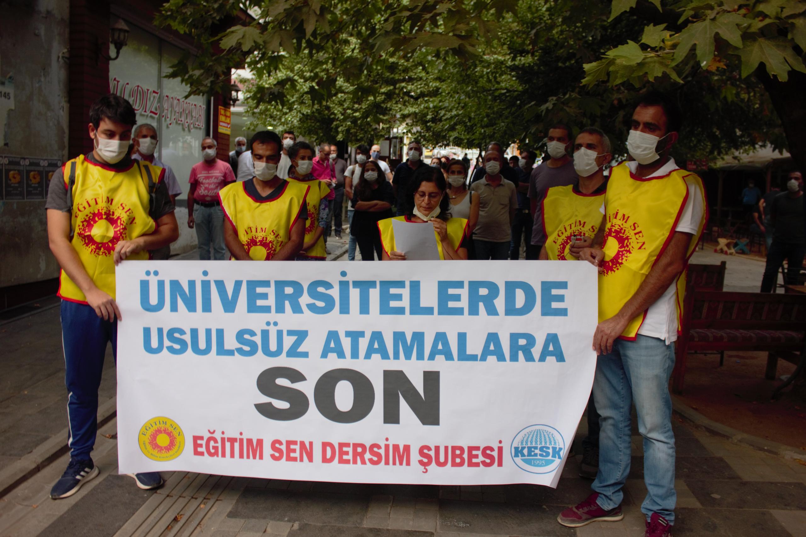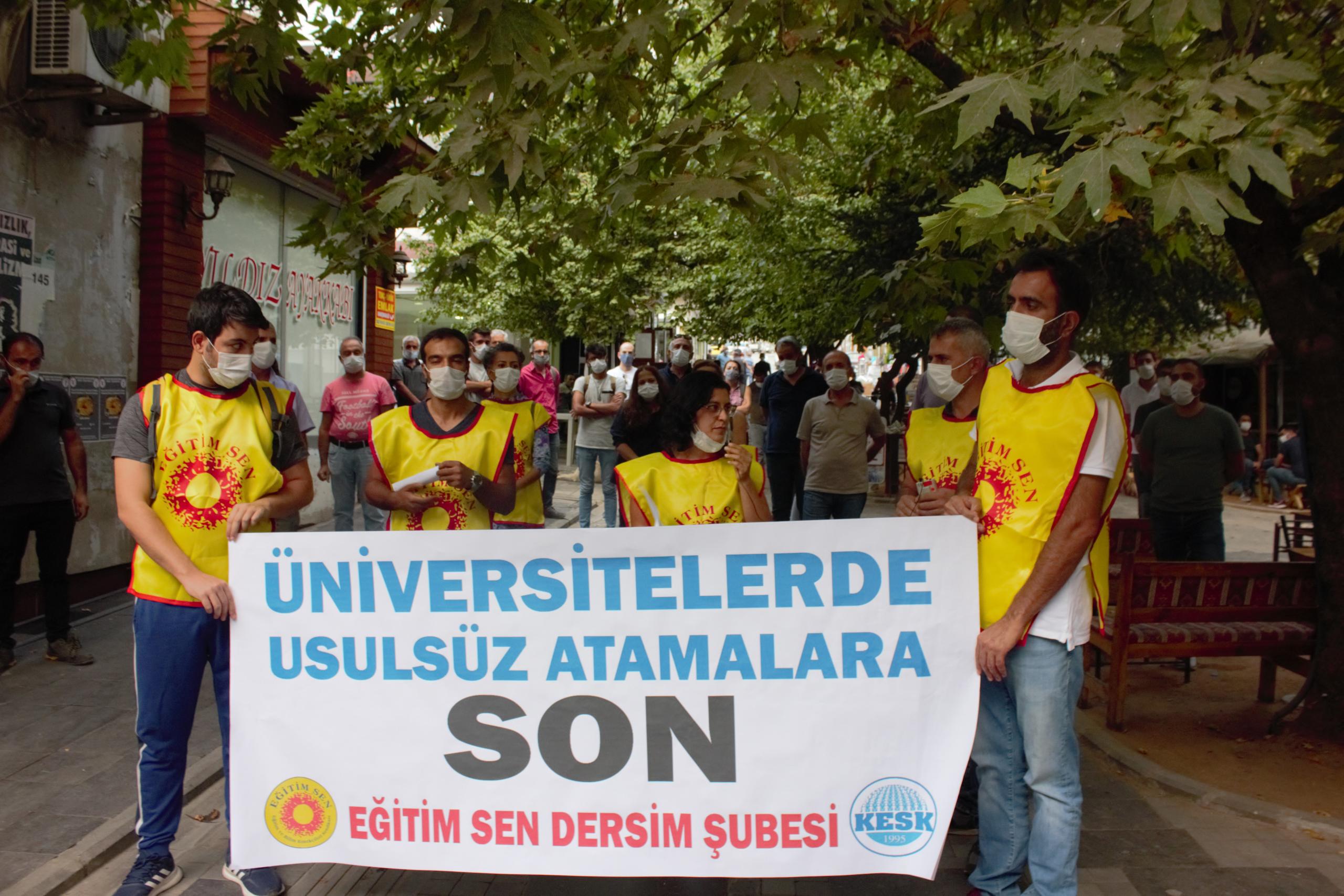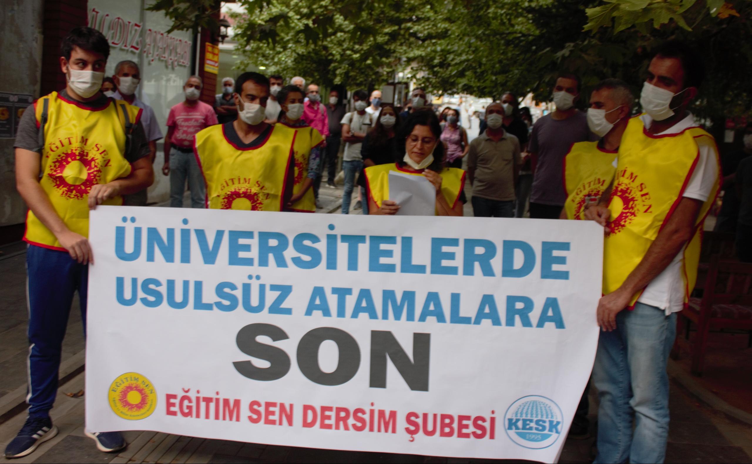 Eğitim-Sen Dersim Şube Sekreteri Raife Yılmaz, “Son günlerde basında yer alan, Munzur Üniversitesinde yapılan usulsüz atamalarla ilgili olarak şunu belirtmek isteriz ki ‘Kanunların kamu yararının sağlanması amacına yönelik olması, genel, objektif, adil kurallar içermesi ve hakkaniyet ölçütlerini gözetmesi hukuk devleti olmanın gereğidir’ gibi bir anayasal hüküm ve liyakat gibi bir kanun ilkesi varken rektörlere tanınan yetkiler bilimsel kaliteyi artırmak içindir, hanedanlık kurmak için değil. Konusu suç teşkil eden emir, hiçbir suretle yerine getirilmez; yerine getiren kimse sorumluluktan kurtulamaz kanun hükmü bulunmasına rağmen artık kamu görevlileri kurum amirleri tarafından kurulan sınav komisyonlarında açıkça suç işlemektedir. Kurum amirinin istediği kişiyi sınavda kazandırmayan ve onun talimatlarına uymayan komisyon üyesi, işi ve kariyeri ile tehdit edilmekte veya herhangi bir örgütle ilişkilendirilmektedir. Yaşanan ihraçlar ve sürgünler bunun en bariz örneği olup kamu çalışanlarını kanuna değil kurum amirinin insafına bırakmıştır” dedi.